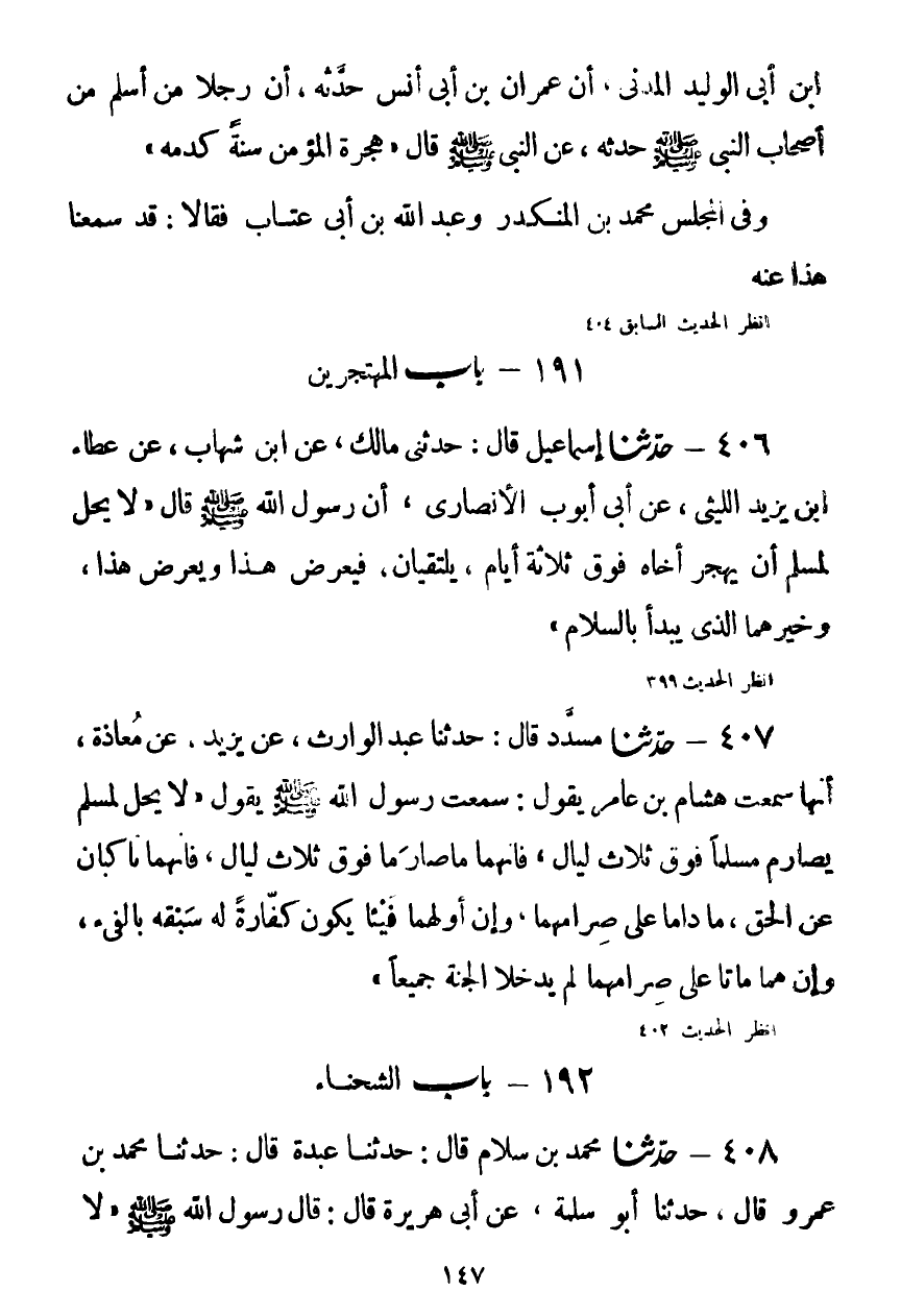 406 - حَدَّثَنَا إِسْمَاعِيلُ قَالَ: حَدَّثَنِي مَالِكٌ، عَنِ ابْنِ شِهَابٍ، عَنْ عَطَاءِ بْنِ يَزِيدَ اللَّيْثِيِّ، عَنْ أَبِي أَيُّوبَ الْأَنْصَارِيِّ، أَنَّ رَسُولَ اللَّهِ صَلَّى اللهُ عَلَيْهِ وَسَلَّمَ قَالَ: «§لَا يَحِلُّ لِمُسْلِمٍ أَنْ يَهْجُرَ أَخَاهُ فَوْقَ ثَلَاثَةِ أَيَّامٍ، يَلْتَقِيَانِ فَيُعْرِضُ هَذَا وَيُعْرِضُ هَذَا، وَخَيْرُهُمَا الَّذِي يَبْدَأُ بِالسَّلَامِ» Kصحيح