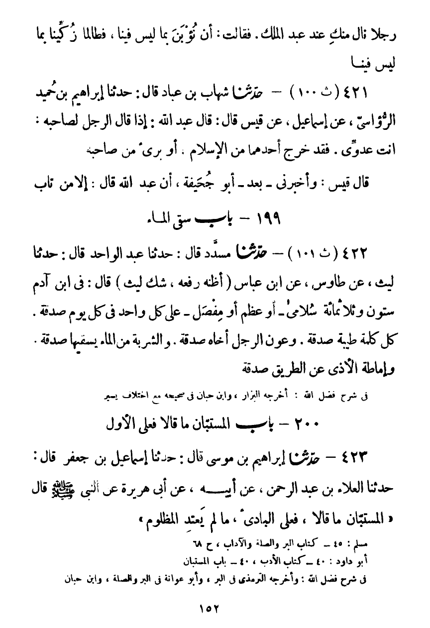 423 - حَدَّثَنَا إِبْرَاهِيمُ بْنُ مُوسَى قَالَ: حَدَّثَنَا إِسْمَاعِيلُ بْنُ جَعْفَرٍ قَالَ: حَدَّثَنَا الْعَلَاءُ بْنُ عَبْدِ الرَّحْمَنِ، عَنْ أَبِيهِ، عَنْ أَبِي هُرَيْرَةَ، عَنِ النَّبِيِّ صَلَّى اللهُ عَلَيْهِ وَسَلَّمَ قَالَ: «§الْمُسْتَبَّانِ مَا قَالَا فَعَلَى الْبَادِئِ، مَا لَمْ يَعْتَدِ الْمَظْلُومُ» Kصحيح