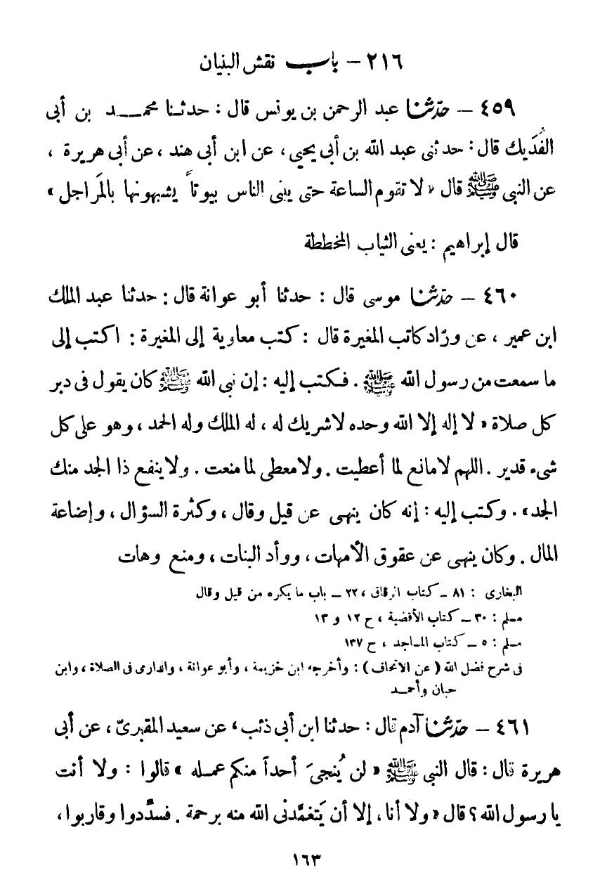 459 - حَدَّثَنَا عَبْدُ الرَّحْمَنِ بْنُ يُونُسَ قَالَ: حَدَّثَنَا مُحَمَّدُ بْنُ أَبِي الْفُدَيْكِ قَالَ: حَدَّثَنِي عَبْدُ اللَّهِ بْنُ أَبِي يَحْيَى، عَنِ ابْنِ أَبِي هِنْدَ، عَنْ أَبِي هُرَيْرَةَ، عَنِ النَّبِيِّ صَلَّى اللهُ عَلَيْهِ وَسَلَّمَ قَالَ: «§لَا تَقُومُ السَّاعَةُ حَتَّى يَبْنِيَ النَّاسُ بُيُوتًا، يُشَبِّهُونَهَا بِالْمَرَاحِلِ» . قَالَ إِبْرَاهِيمُ: يَعْنِي الثِّيَابَ الْمُخَطَّطَةَKصحيح
