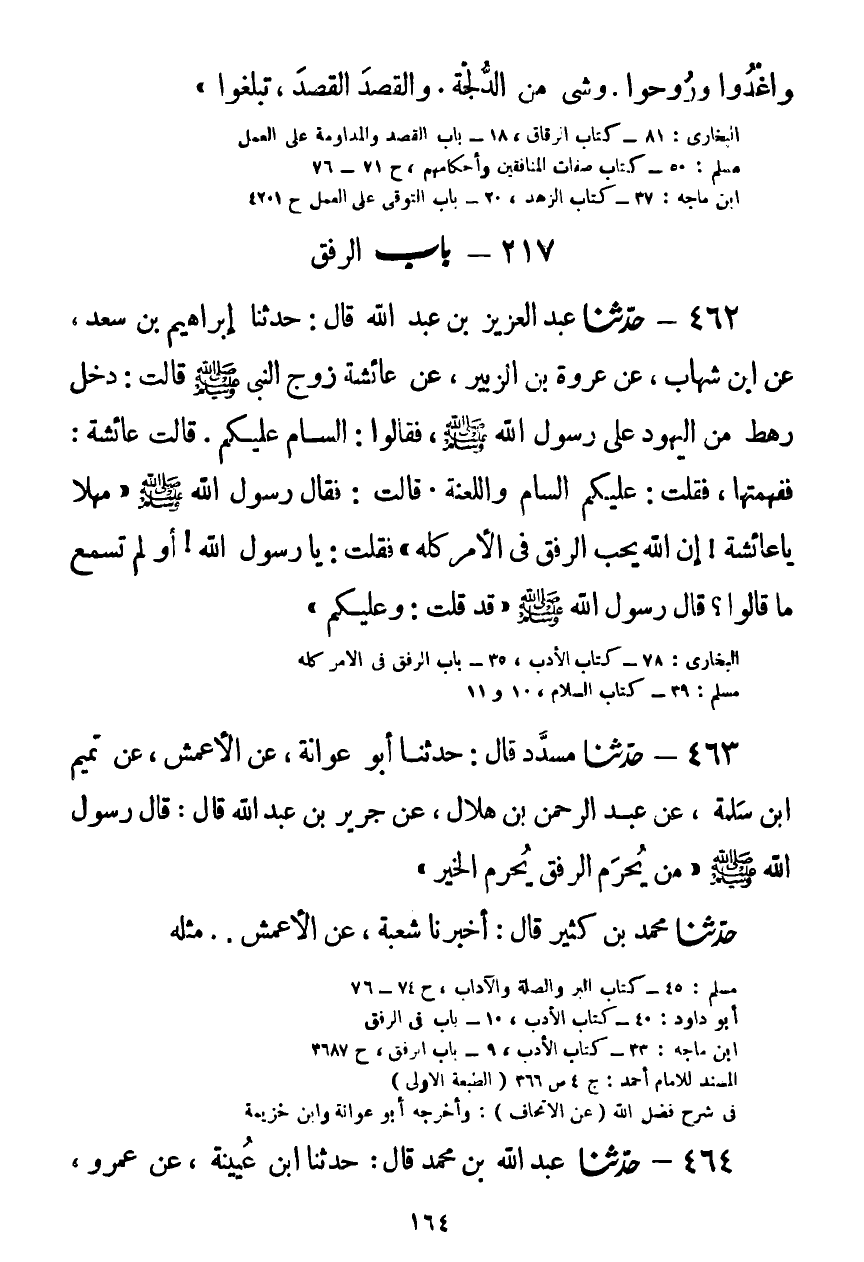 462 - حَدَّثَنَا عَبْدُ الْعَزِيزِ بْنُ عَبْدِ اللَّهِ قَالَ: حَدَّثَنَا إِبْرَاهِيمُ بْنُ سَعْدٍ، عَنِ ابْنِ شِهَابٍ، عَنْ عُرْوَةَ بْنِ الزُّبَيْرِ، عَنْ عَائِشَةَ زَوْجِ النَّبِيِّ صَلَّى اللهُ عَلَيْهِ وَسَلَّمَ قَالَتْ: دَخَلَ رَهْطٌ مِنَ الْيَهُودِ عَلَى رَسُولِ اللَّهِ صَلَّى اللهُ عَلَيْهِ وَسَلَّمَ فَقَالُوا: السَّامُ عَلَيْكُمْ، قَالَتْ عَائِشَةُ فَفَهِمْتُهَا فَقُلْتُ: عَلَيْكُمُ السَّامُ وَاللَّعْنَةُ، قَالَتْ: فَقَالَ رَسُولُ اللَّهِ صَلَّى اللهُ عَلَيْهِ وَسَلَّمَ: مَهْلًا يَا عَائِشَةُ، إِنَّ §اللَّهَ يُحِبُّ الرِّفْقَ فِي الْأَمْرِ كُلِّهِ "، فَقُلْتُ: يَا رَسُولَ اللَّهِ، أَوَ لَمْ تَسْمَعْ مَا قَالُوا؟ قَالَ رَسُولُ اللَّهِ صَلَّى اللهُ عَلَيْهِ وَسَلَّمَ: " قَدْ قُلْتُ: وَعَلَيْكُمْ "Kصحيح