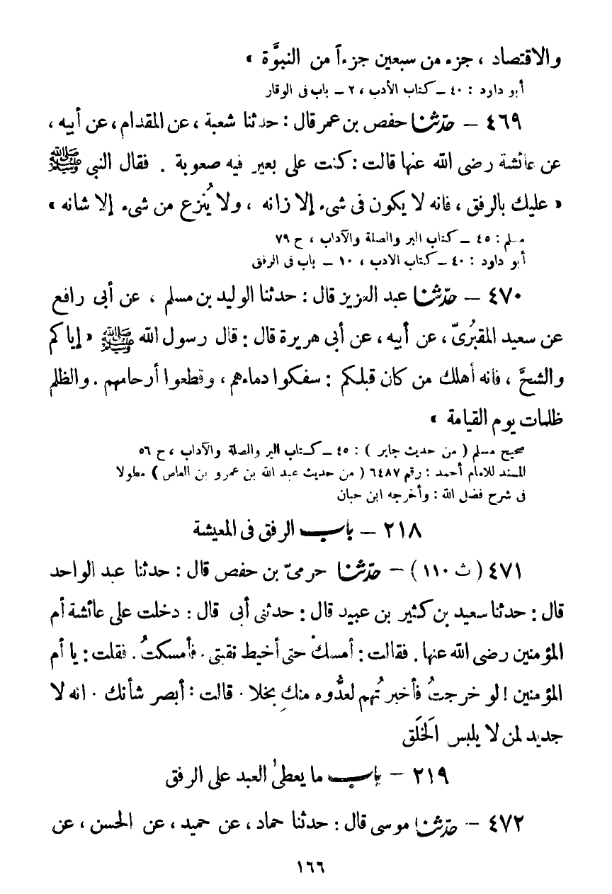 469 - حَدَّثَنَا حَفْصُ بْنُ عُمَرَ قَالَ: حَدَّثَنَا شُعْبَةُ، عَنِ الْمِقْدَامِ، عَنْ أَبِيهِ، عَنْ عَائِشَةَ رَضِيَ اللَّهُ عَنْهَا قَالَتْ: كُنْتُ عَلَى بَعِيرٍ فِيهِ صُعُوبَةٌ، فَقَالَ النَّبِيُّ صَلَّى اللهُ عَلَيْهِ وَسَلَّمَ: «§عَلَيْكِ بِالرِّفْقِ، فَإِنَّهُ لَا يَكُونُ فِي شَيْءٍ إِلَّا زَانَهُ، وَلَا يُنْزَعُ مِنْ شَيْءٍ إِلَّا شَانَهُ» Kصحيح