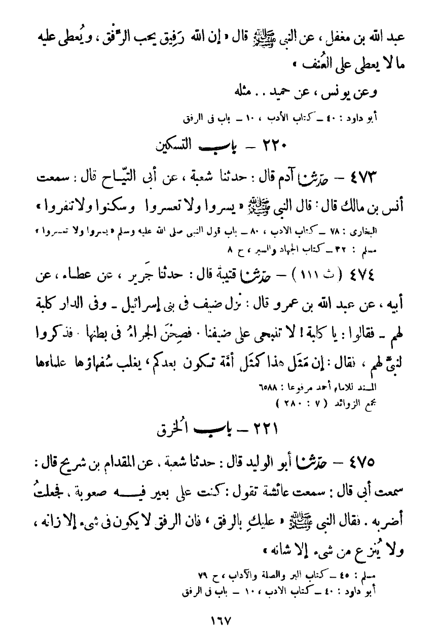 475 - حَدَّثَنَا أَبُو الْوَلِيدِ قَالَ: حَدَّثَنَا شُعْبَةُ، عَنِ الْمِقْدَامِ بْنِ شُرَيْحٍ قَالَ: سَمِعْتُ أَبِي قَالَ: سَمِعْتُ عَائِشَةَ تَقُولُ: كُنْتُ عَلَى بَعِيرٍ فِيهِ صُعُوبَةٌ، فَجَعَلْتُ أَضْرِبُهُ، فَقَالَ النَّبِيُّ صَلَّى اللهُ عَلَيْهِ وَسَلَّمَ: «§عَلَيْكِ بِالرِّفْقِ، فَإِنَّ الرِّفْقَ لَا يَكُونُ فِي شَيْءٍ إِلَّا زَانَهُ، وَلَا يُنْزَعُ مِنْ شَيْءٍ إِلَّا شَانَهُ» Kصحيح