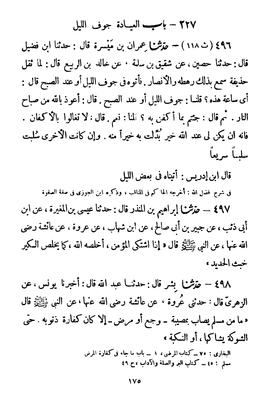 496 - حَدَّثَنَا عِمْرَانُ بْنُ مَيْسَرَةَ قَالَ: حَدَّثَنَا ابْنُ فُضَيْلٍ قَالَ: حَدَّثَنَا حُصَيْنٌ، عَنْ شَقِيقِ بْنِ سَلَمَةَ، عَنْ خَالِدِ بْنِ الرَّبِيعِ قَالَ: لَمَّا ثَقُلَ حُذَيْفَةُ سَمِعَ بِذَلِكَ رَهْطُهُ وَالْأَنْصَارُ، فَأَتَوْهُ فِي جَوْفِ اللَّيْلِ أَوْ عِنْدَ الصُّبْحِ، قَالَ: أَيُّ سَاعَةٍ هَذِهِ؟ قُلْنَا: جَوْفُ اللَّيْلِ أَوْ عِنْدَ الصُّبْحِ، قَالَ: أَعُوذُ بِاللَّهِ مِنْ صَبَاحِ النَّارِ، قَالَ: جِئْتُمْ بِمَا أُكَفَّنُ بِهِ؟ قُلْنَا: نَعَمْ، قَالَ: §لَا تُغَالُوا بِالْأَكْفَانِ، فَإِنَّهُ إِنْ يَكُنْ لِي عِنْدَ اللَّهِ خَيْرٌ بُدِّلْتُ بِهِ خَيْرًا مِنْهُ، وَإِنْ كَانَتِ الْأُخْرَى سُلِبْتُ سَلْبًا سَرِيعًا " قَالَ ابْنُ إِدْرِيسَ: أَتَيْنَاهُ فِي بَعْضِ اللَّيْلِKضعيف