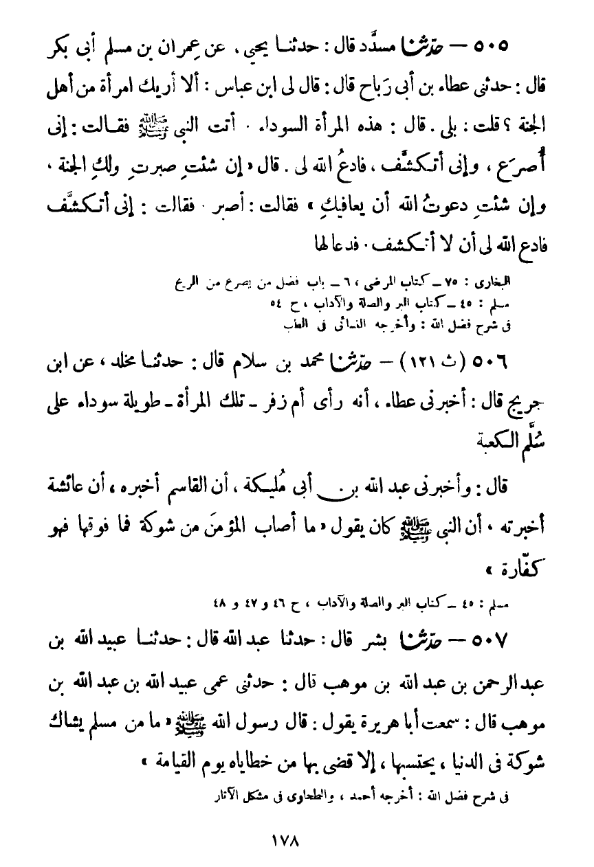 505 - حَدَّثَنَا مُسَدَّدٌ قَالَ: حَدَّثَنَا يَحْيَى، عَنْ عِمْرَانَ بْنِ مُسْلِمٍ أَبِي بَكْرٍ قَالَ: حَدَّثَنِي عَطَاءُ بْنُ أَبِي رَبَاحٍ قَالَ: قَالَ لِيَ ابْنُ عَبَّاسٍ: أَلَا أُرِيكَ امْرَأَةً مِنْ أَهْلِ الْجَنَّةِ؟ قُلْتُ: بَلَى، قَالَ: هَذِهِ الْمَرْأَةُ السَّوْدَاءُ أَتَتِ النَّبِيَّ صَلَّى اللهُ عَلَيْهِ وَسَلَّمَ فَقَالَتْ: إِنِّي أُصْرَعُ، وَإِنِّي أَتَكَشَّفُ، فَادْعُ اللَّهَ لِي، قَالَ: «§إِنْ شِئْتِ صَبَرْتِ وَلَكِ الْجَنَّةُ، وَإِنْ شِئْتِ دَعَوْتُ اللَّهَ أَنْ يُعَافِيَكَ» ، فَقَالَتْ: أَصْبِرُ، فَقَالَتْ: إِنِّي أَتَكَشَّفُ، فَادْعُ اللَّهَ لِي أَنْ لَا أَتَكَشَّفَ، فَدَعَا لَهَاKصحيح