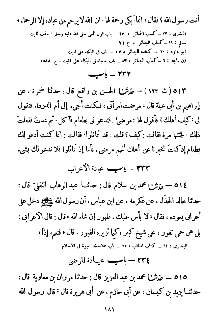 514 - حَدَّثَنَا مُحَمَّدُ بْنُ سَلَّامٍ قَالَ: حَدَّثَنَا عَبْدُ الْوَهَّابِ الثَّقَفِيُّ قَالَ: حَدَّثَنَا خَالِدٌ الْحَذَّاءُ، عَنْ عِكْرِمَةَ، عَنِ ابْنِ عَبَّاسٍ، أَنَّ رَسُولَ اللَّهِ صَلَّى اللهُ عَلَيْهِ وَسَلَّمَ دَخَلَ عَلَى أَعْرَابِيٍّ يَعُودُهُ، فَقَالَ: «§لَا بَأْسَ عَلَيْكَ، طَهُورٌ إِنْ شَاءَ اللَّهُ» ، قَالَ: قَالَ الْأَعْرَابِيُّ: بَلْ هِيَ حُمَّى تَفُورُ، عَلَى شَيْخٍ كَبِيرٍ، كَيْمَا تُزِيرُهُ الْقُبُورَ، قَالَ: «فَنَعَمْ إِذًا» Kصحيح