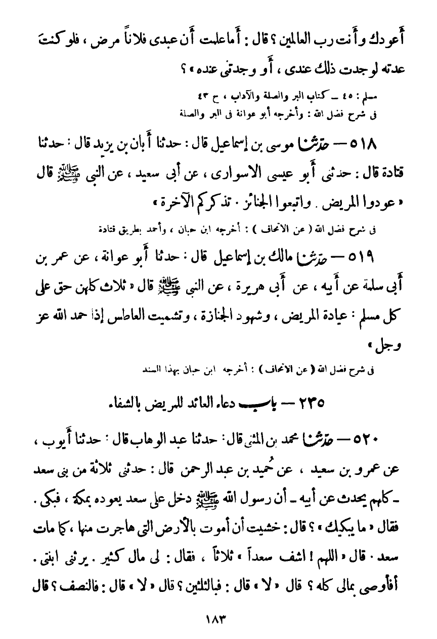 520 - حَدَّثَنَا مُحَمَّدُ بْنُ الْمُثَنَّى قَالَ: حَدَّثَنَا عَبْدُ الْوَهَّابِ قَالَ: حَدَّثَنَا أَيُّوبُ، عَنْ عَمْرِو بْنِ سَعِيدٍ، عَنْ حُمَيْدِ بْنِ عَبْدِ الرَّحْمَنِ قَالَ: حَدَّثَنِي ثَلَاثَةٌ مِنْ بَنِي سَعْدٍ كُلُّهُمْ يُحَدِّثُ عَنْ أَبِيهِ أَنَّ رَسُولَ اللَّهِ صَلَّى اللهُ عَلَيْهِ وَسَلَّمَ دَخَلَ عَلَى سَعْدٍ يَعُودُهُ بِمَكَّةَ، فَبَكَى، فَقَالَ: «مَا يُبْكِيكَ؟» ، قَالَ: خَشِيتُ أَنْ أَمُوتَ بِالْأَرْضِ الَّتِي هَاجَرْتُ مِنْهَا كَمَا مَاتَ سَعْدٌ، قَالَ: «§اللَّهُمَّ اشْفِ سَعْدًا» ثَلَاثًا، فَقَالَ: لِي مَالٌ كَثِيرٌ، يَرِثُنِي ابْنَتَيْ، أَفَأُوصِي بِمَالِي كُلِّهِ؟ قَالَ: «لَا» ، قَالَ: فَبِالثُّلُثَيْنِ؟ قَالَ: «لَا» ، قَالَ: فَالنِّصْفُ؟ قَالَ: «لَا» ، قَالَ: فَالثُّلُثُ؟ قَالَ: " الثُّلُثُ، وَالثُّلُثُ كَثِيرٌ، إِنَّ صَدَقَتَكَ مِنْ مَالِكَ صَدَقَةٌ، وَنَفَقَتَكَ عَلَى عِيَالِكَ صَدَقَةٌ، وَمَا تَأْكُلُ امْرَأَتُكَ مِنْ طَعَامِكَ لَكَ صَدَقَةٌ، وَإِنَّكَ أَنْ تَدَعَ أَهْلَكَ بِخَيْرٍ - أَوْ قَالَ: بِعَيْشٍ - خَيْرٌ مِنْ أَنْ تَدَعَهُمْ يَتَكَفَّفُونَ النَّاسَ "، وَقَالَ بِيَدِهِKصحيح