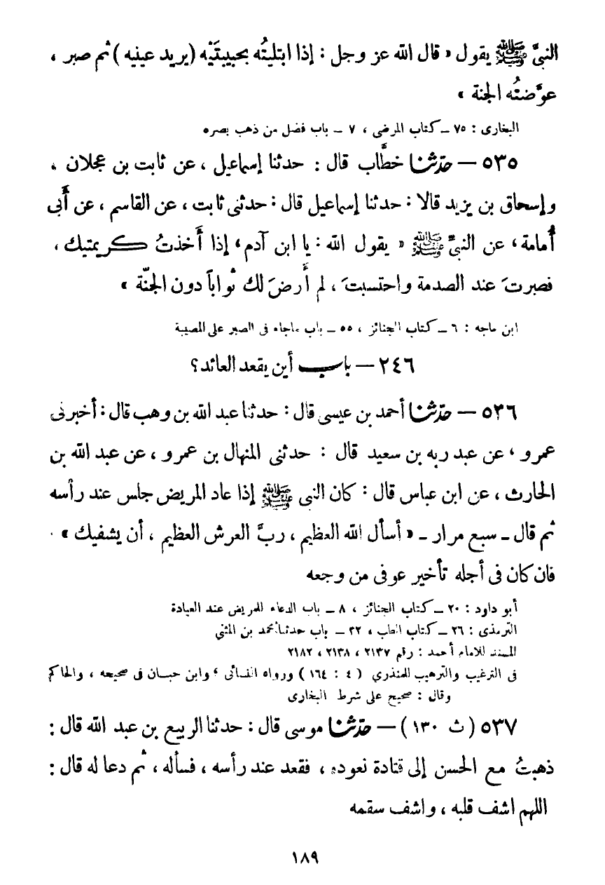 536 - حَدَّثَنَا أَحْمَدُ بْنُ عِيسَى قَالَ: حَدَّثَنَا عَبْدُ اللَّهِ بْنُ وَهْبٍ قَالَ: أَخْبَرَنِي عَمْرٌو، عَنْ عَبْدِ رَبِّهِ بْنِ سَعِيدٍ قَالَ: حَدَّثَنِي الْمِنْهَالُ بْنُ عَمْرٍو، عَنْ عَبْدِ اللَّهِ بْنِ الْحَارِثِ، عَنِ ابْنِ عَبَّاسٍ قَالَ: كَانَ النَّبِيُّ صَلَّى اللهُ عَلَيْهِ وَسَلَّمَ إِذَا عَادَ الْمَرِيضَ جَلَسَ عِنْدَ رَأْسِهِ، ثُمَّ قَالَ سَبْعَ مِرَارٍ: «§أَسْأَلُ اللَّهَ الْعَظِيمَ، رَبَّ الْعَرْشِ الْعَظِيمِ، أَنْ يَشْفِيكَ» ، فَإِنْ كَانَ فِي أَجَلِهِ تَأْخِيرٌ عُوفِيَ مِنْ وَجَعِهِKصحيح