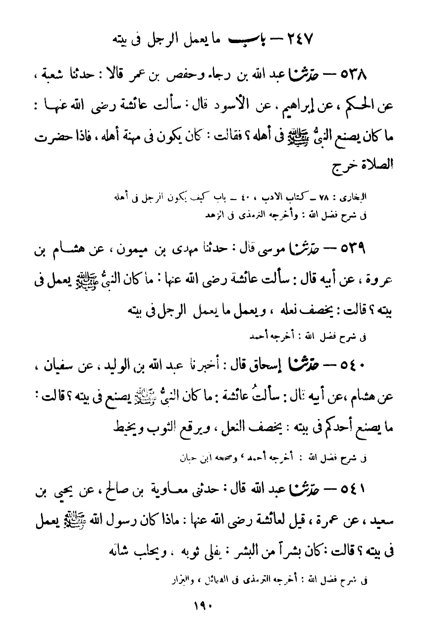 540 - حَدَّثَنَا إِسْحَاقُ قَالَ: أَخْبَرَنَا عَبْدُ اللَّهِ بْنُ الْوَلِيدِ، عَنْ سُفْيَانَ، عَنْ هِشَامٍ، عَنْ أَبِيهِ قَالَ: سَأَلْتُ عَائِشَةَ: مَا كَانَ النَّبِيُّ صَلَّى اللهُ عَلَيْهِ وَسَلَّمَ يَصْنَعُ فِي بَيْتِهِ؟ قَالَتْ: مَا يَصْنَعُ أَحَدُكُمْ فِي بَيْتِهِ، §يَخْصِفُ النَّعْلَ، وَيَرْقَعُ الثَّوْبَ، وَيَخِيطُKصحيح