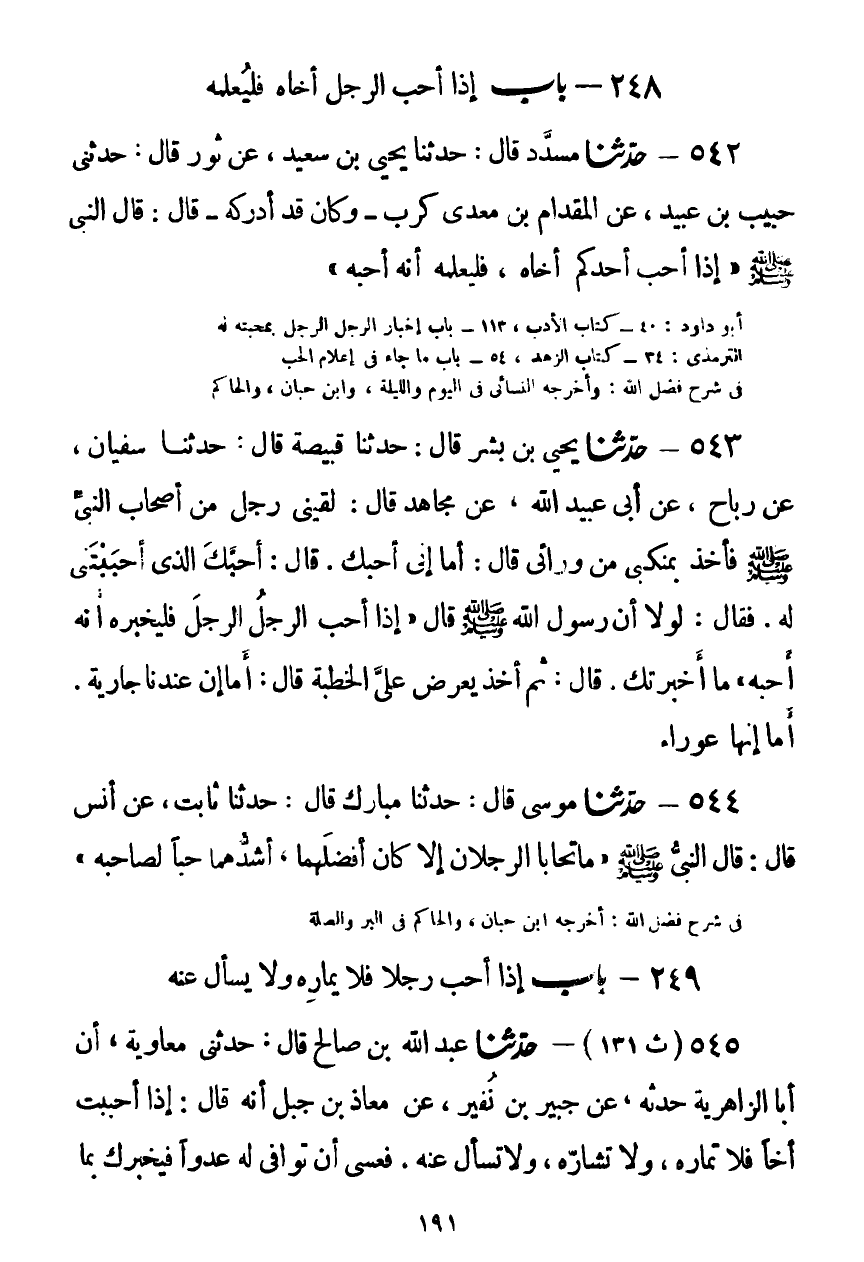 542 - حَدَّثَنَا مُسَدَّدٌ قَالَ: حَدَّثَنَا يَحْيَى بْنُ سَعِيدٍ، عَنْ ثَوْرٍ قَالَ: حَدَّثَنِي حَبِيبُ بْنُ عُبَيْدٍ، عَنِ الْمِقْدَامِ بْنِ مَعْدِي كَرِبَ، وَكَانَ قَدْ أَدْرَكَهُ، قَالَ: قَالَ النَّبِيُّ صَلَّى اللهُ عَلَيْهِ وَسَلَّمَ: «§إِذَا أَحَبَّ أَحَدُكُمْ أَخَاهُ فَلْيُعْلِمْهُ أَنَّهُ أَحَبَّهُ» Kصحيح