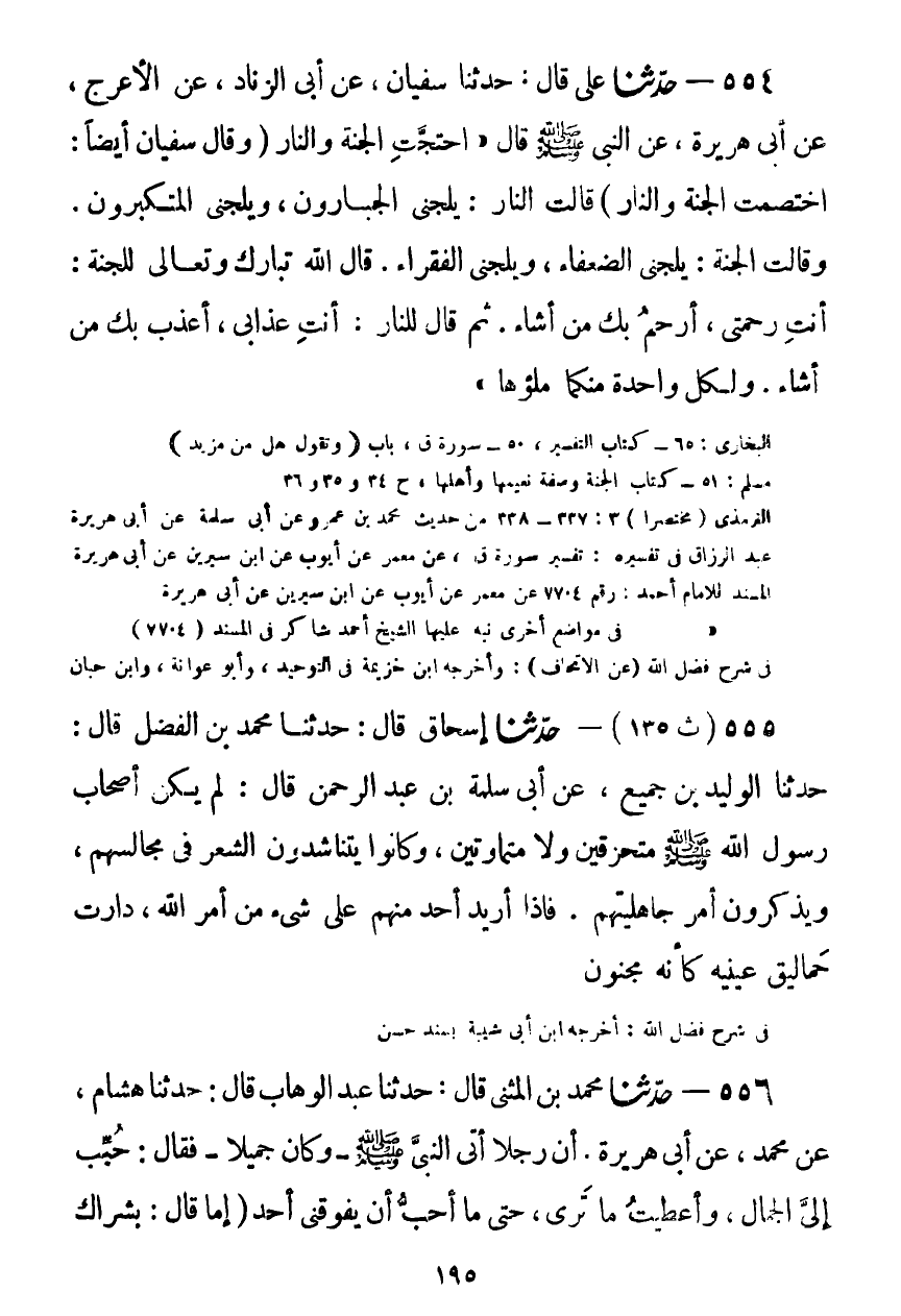 554 - حَدَّثَنَا عَلِيٌّ قَالَ: حَدَّثَنَا سُفْيَانُ، عَنْ أَبِي الزِّنَادِ، عَنِ الْأَعْرَجِ، عَنْ أَبِي هُرَيْرَةَ، عَنِ النَّبِيِّ صَلَّى اللهُ عَلَيْهِ وَسَلَّمَ قَالَ: " احْتَجَّتِ الْجَنَّةُ وَالنَّارُ - وَقَالَ سُفْيَانُ أَيْضًا: §اخْتَصَمَتِ الْجَنَّةُ وَالنَّارُ - قَالَتِ النَّارُ: يَلِجُنِي الْجَبَّارُونَ، وَيَلِجُنِي الْمُتَكَبِّرُونَ، وَقَالَتِ الْجَنَّةُ: يَلِجُنِي الضُّعَفَاءُ، وَيَلِجُنِي الْفُقَرَاءُ. قَالَ اللَّهُ تَبَارَكَ وَتَعَالَى لِلْجَنَّةِ: أَنْتِ رَحْمَتِي أَرْحَمُ بِكِ مَنْ أَشَاءُ، ثُمَّ قَالَ لِلنَّارِ: أَنْتِ عَذَابِي أُعَذِّبُ بِكِ مَنْ أَشَاءُ، وَلِكُلِّ وَاحِدَةٍ مِنْكُمَا مِلْؤُهَا "Kصحيح