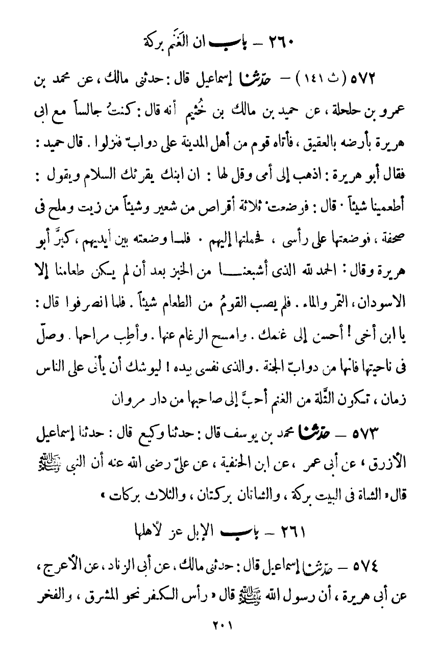572 - حَدَّثَنَا إِسْمَاعِيلُ قَالَ: حَدَّثَنِي مَالِكٌ، عَنْ مُحَمَّدِ بْنِ عَمْرِو بْنِ حَلْحَلَةَ، عَنْ حُمَيْدِ بْنِ مَالِكِ بْنِ خُثَيْمٍ أَنَّهُ قَالَ: كُنْتُ جَالِسًا مَعَ أَبِي هُرَيْرَةَ بِأَرْضِهِ بِالْعَقِيقِ، فَأَتَاهُ قَوْمٌ مِنْ أَهْلِ الْمَدِينَةِ عَلَى دَوَابَّ، فَنَزَلُوا، قَالَ حُمَيْدٌ: فَقَالَ أَبُو هُرَيْرَةَ: اذْهَبْ إِلَى أُمِّي وَقُلْ لَهَا: إِنَّ ابْنَكِ يُقْرِئُكِ السَّلَامَ وَيَقُولُ: أَطْعِمِينَا شَيْئًا، قَالَ: فَوَضَعَتْ ثَلَاثَةَ أَقْرَاصٍ مِنْ شَعِيرٍ، وَشَيْئًا مِنْ زَيْتٍ وَمِلْحٍ فِي صَحْفَةٍ، فَوَضَعْتُهَا عَلَى رَأْسِي، فَحَمَلْتُهَا إِلَيْهِمْ، فَلَمَّا وَضَعْتُهُ بَيْنَ أَيْدِيهِمْ، كَبَّرَ أَبُو هُرَيْرَةَ وَقَالَ: الْحَمْدُ لِلَّهِ الَّذِي أَشْبَعَنَا مِنَ الْخُبْزِ بَعْدَ أَنْ لَمْ يَكُنْ طَعَامُنَا إِلَّا الْأَسْوَدَانِ: التَّمْرُ وَالْمَاءُ، فَلَمْ يُصِبِ الْقَوْمُ مِنَ الطَّعَامِ شَيْئًا، فَلَمَّا انْصَرَفُوا قَالَ: يَا ابْنَ أَخِي، §أَحْسِنْ إِلَى غَنَمِكَ، وَامْسَحْ الرُّغَامَ عَنْهَا، وَأَطِبْ مُرَاحَهَا، وَصَلِّ فِي نَاحِيَتِهَا، فَإِنَّهَا مِنْ دَوَابِّ الْجَنَّةِ، وَالَّذِي نَفْسِي بِيَدِهِ لَيُوشِكُ أَنْ يَأْتِيَ عَلَى النَّاسِ زَمَانٌ تَكُونُ الثُّلَّةُ مِنَ الْغَنَمِ أَحَبَّ إِلَى صَاحِبِهَا مِنْ دَارِ مَرْوَانَKصحيح الإسناد وجملة الصلاة في مراح الغنم ومسح رغامها وأنها من دواب الجنة صحيح مرفوعا