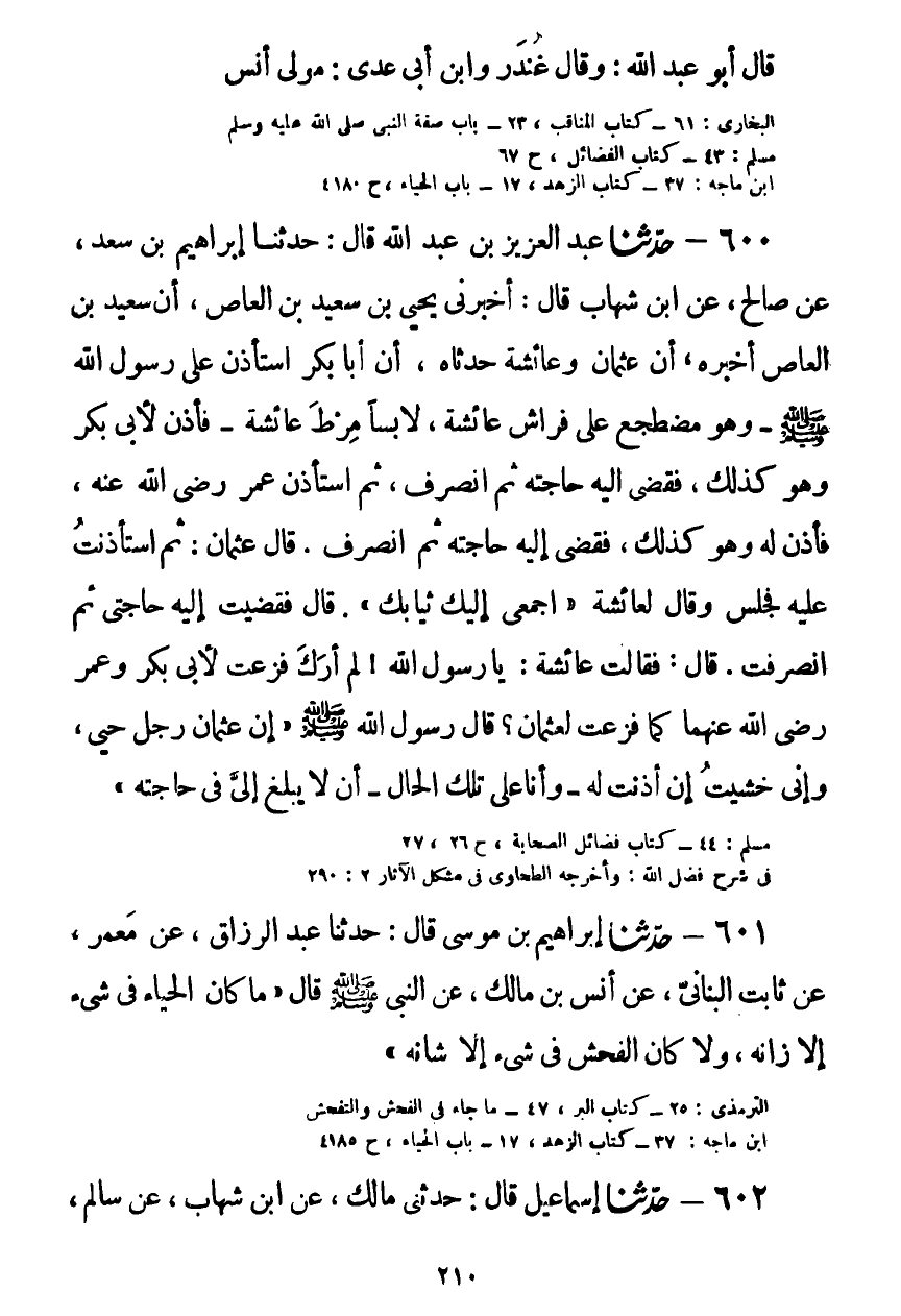 600 - حَدَّثَنَا عَبْدُ الْعَزِيزِ بْنُ عَبْدِ اللَّهِ قَالَ: حَدَّثَنَا إِبْرَاهِيمُ بْنُ سَعْدٍ، عَنْ صَالِحٍ، عَنِ ابْنِ شِهَابٍ قَالَ: أَخْبَرَنِي يَحْيَى بْنُ سَعِيدِ بْنِ الْعَاصِ، أَنَّ سَعِيدَ بْنَ الْعَاصِ أَخْبَرَهُ، أَنَّ عُثْمَانَ وَعَائِشَةَ، حَدَّثَاهُ، أَنَّ أَبَا بَكْرٍ اسْتَأْذَنَ عَلَى رَسُولِ اللَّهِ صَلَّى اللهُ عَلَيْهِ وَسَلَّمَ، وَهُوَ مُضْطَجِعٌ عَلَى فِرَاشِ عَائِشَةَ لَابِسًا مِرْطَ عَائِشَةَ، فَأَذِنَ لِأَبِي بَكْرٍ وَهُوَ كَذَلِكَ، فَقَضَى إِلَيْهِ حَاجَتَهُ، ثُمَّ انْصَرَفَ. ثُمَّ اسْتَأْذَنَ عُمَرُ رَضِيَ اللَّهُ عَنْهُ، فَأَذِنَ لَهُ وَهُوَ كَذَلِكَ، فَقَضَى إِلَيْهِ حَاجَتَهُ، ثُمَّ انْصَرَفَ. قَالَ عُثْمَانُ: ثُمَّ اسْتَأْذَنْتُ عَلَيْهِ، فَجَلَسَ وَقَالَ لِعَائِشَةَ: «اجْمَعِي إِلَيْكِ ثِيَابَكِ» ، قَالَ: فَقَضَيْتُ إِلَيْهِ حَاجَتِي، ثُمَّ انْصَرَفْتُ، قَالَ: فَقَالَتْ عَائِشَةُ: يَا رَسُولَ اللَّهِ، لَمْ أَرَكَ فَزِعْتَ لِأَبِي بَكْرٍ وَعُمَرَ رَضِيَ اللَّهُ عَنْهُمَا كَمَا فَزِعْتَ لِعُثْمَانَ؟ قَالَ رَسُولُ اللَّهِ صَلَّى اللهُ عَلَيْهِ وَسَلَّمَ: «§إِنَّ عُثْمَانَ رَجُلٌ حَيِيٌّ، وَإِنِّي خَشِيتُ إِنْ أَذِنْتُ لَهُ، وَأَنَا عَلَى تِلْكَ الْحَالِ، أَنْ لَا يَبْلُغَ إِلَيَّ فِي حَاجَتِهِ» Kصحيح