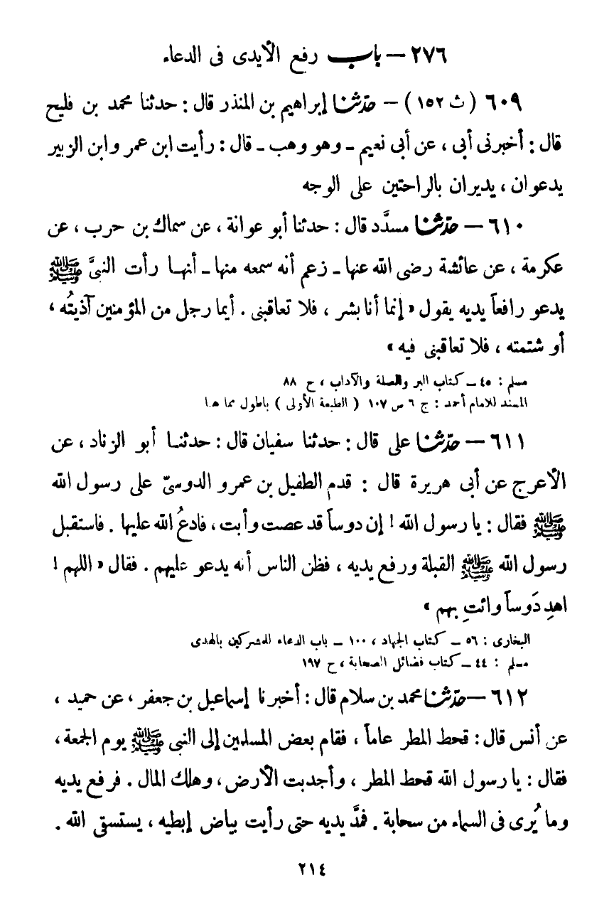 611 - حَدَّثَنَا عَلِيٌّ قَالَ: حَدَّثَنَا سُفْيَانُ قَالَ: حَدَّثَنَا أَبُو الزِّنَادِ، عَنِ الْأَعْرَجِ، عَنْ أَبِي هُرَيْرَةَ قَالَ: قَدِمَ الطُّفَيْلُ بْنُ عَمْرٍو الدَّوْسِيُّ عَلَى رَسُولِ اللَّهِ صَلَّى اللهُ عَلَيْهِ وَسَلَّمَ فَقَالَ: يَا رَسُولَ اللَّهِ، إِنَّ دَوْسًا قَدْ عَصَتْ وَأَبَتْ، فَادْعُ اللَّهَ عَلَيْهَا، فَاسْتَقْبَلَ رَسُولُ اللَّهِ صَلَّى اللهُ عَلَيْهِ وَسَلَّمَ الْقِبْلَةَ وَرَفَعَ يَدَيْهِ، فَظَنَّ النَّاسُ أَنَّهُ يَدْعُو عَلَيْهِمْ، فَقَالَ: «§اللَّهُمَّ اهْدِ دَوْسًا، وَائْتِ بِهِمْ» Kصحيح