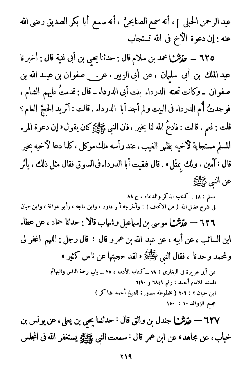 625 - حَدَّثَنَا مُحَمَّدُ بْنُ سَلَّامٍ قَالَ: حَدَّثَنَا يَحْيَى بْنُ أَبِي غَنِيَّةَ قَالَ: أَخْبَرَنَا عَبْدُ الْمَلِكِ بْنُ أَبِي سُلَيْمَانَ، عَنْ أَبِي الزُّبَيْرِ، عَنْ صَفْوَانَ بْنِ عَبْدِ اللَّهِ بْنِ صَفْوَانَ، وَكَانَتْ تَحْتَهُ الدَّرْدَاءُ بِنْتُ أَبِي الدَّرْدَاءِ، قَالَ: قَدِمْتُ عَلَيْهِمُ الشَّامَ، فَوَجَدْتُ أُمَّ الدَّرْدَاءِ فِي الْبَيْتِ، وَلَمْ أَجِدْ أَبَا الدَّرْدَاءِ، قَالَتْ: أَتُرِيدُ الْحَجَّ الْعَامَ؟ قُلْتُ: نَعَمْ، قَالَتْ: فَادْعُ اللَّهَ لَنَا بِخَيْرٍ، فَإِنَّ النَّبِيَّ صَلَّى اللهُ عَلَيْهِ وَسَلَّمَ كَانَ يَقُولُ: " إِنَّ §دَعْوَةَ الْمَرْءِ الْمُسْلِمِ مُسْتَجَابَةٌ لِأَخِيهِ بِظَهْرِ الْغَيْبِ، عِنْدَ رَأْسِهِ مَلَكٌ مُوَكَّلٌ، كُلَّمَا دَعَا لِأَخِيهِ بِخَيْرٍ قَالَ: آمِينَ، وَلَكَ بِمِثْلٍ "، قَالَ: فَلَقِيتُ أَبَا الدَّرْدَاءِ فِي السُّوقِ فَقَالَ مِثْلَ ذَلِكَ، يَأْثُرُ عَنِ النَّبِيِّ صَلَّى اللهُ عَلَيْهِ وَسَلَّمَKصحيح