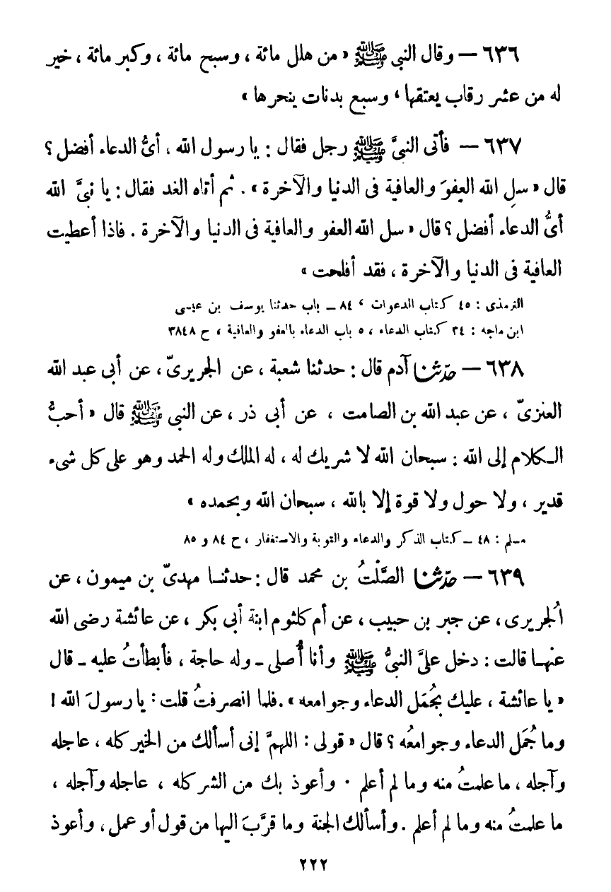 637 - فَأَتَى النَّبِيَّ صَلَّى اللهُ عَلَيْهِ وَسَلَّمَ رَجُلٌ فَقَالَ: يَا رَسُولَ اللَّهِ، أَيُّ الدُّعَاءِ أَفْضَلُ؟ قَالَ: «سَلِ اللَّهَ الْعَفْوَ وَالْعَافِيَةَ فِي الدُّنْيَا وَالْآخِرَةِ» ، ثُمَّ أَتَاهُ الْغَدَ فَقَالَ: يَا نَبِيَّ اللَّهِ، أَيُّ الدُّعَاءِ أَفْضَلُ؟ قَالَ: «§سَلِ اللَّهَ الْعَفْوَ وَالْعَافِيَةَ فِي الدُّنْيَا وَالْآخِرَةِ، فَإِذَا أُعْطِيتَ الْعَافِيَةَ فِي الدُّنْيَا وَالْآخِرَةِ فَقَدْ أَفْلَحْتَ» Kصحيح