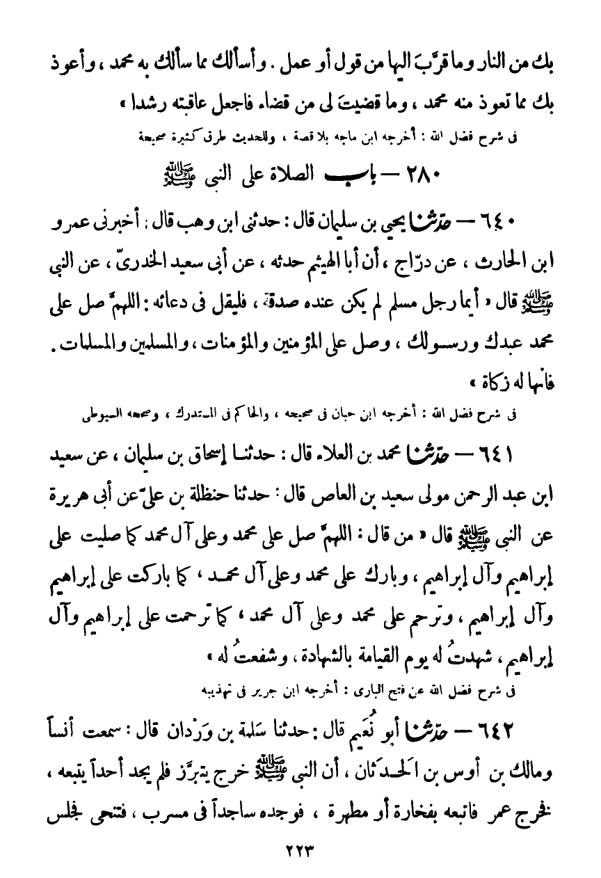 641 - حَدَّثَنَا مُحَمَّدُ بْنُ الْعَلَاءِ قَالَ: حَدَّثَنَا إِسْحَاقُ بْنُ سُلَيْمَانَ، عَنْ سَعِيدِ بْنِ عَبْدِ الرَّحْمَنِ، مَوْلَى سَعِيدِ بْنِ الْعَاصِ قَالَ: حَدَّثَنَا حَنْظَلَةُ بْنُ عَلِيٍّ، عَنْ أَبِي هُرَيْرَةَ، عَنِ النَّبِيِّ صَلَّى اللهُ عَلَيْهِ وَسَلَّمَ قَالَ: " مَنْ قَالَ: §اللَّهُمَّ صَلِّ عَلَى مُحَمَّدٍ، وَعَلَى آلِ مُحَمَّدٍ، كَمَا صَلَّيْتَ عَلَى إِبْرَاهِيمَ وَآلِ إِبْرَاهِيمَ، وَبَارِكْ عَلَى مُحَمَّدٍ، وَعَلَى آلِ مُحَمَّدٍ، كَمَا بَارَكْتَ عَلَى إِبْرَاهِيمَ وَآلِ إِبْرَاهِيمَ، وَتَرَحَّمْ عَلَى مُحَمَّدٍ، وَعَلَى آلِ مُحَمَّدٍ، كَمَا تَرَحَّمْتَ عَلَى إِبْرَاهِيمَ وَآلِ إِبْرَاهِيمَ، شَهِدْتُ لَهُ يَوْمَ الْقِيَامَةِ بِالشَّهَادَةِ، وَشَفَعْتُ لَهُ "Kضعيف