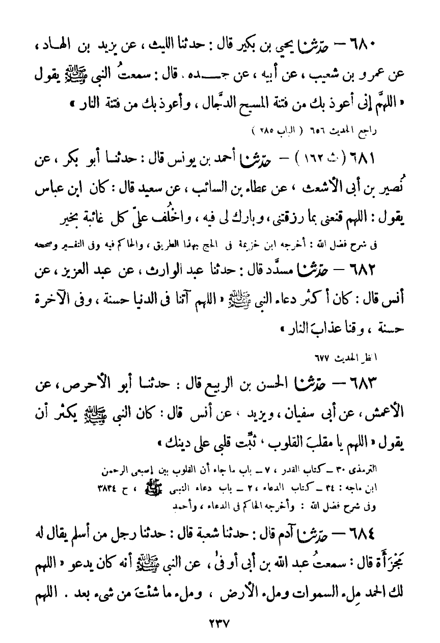 683 - حَدَّثَنَا الْحَسَنُ بْنُ الرَّبِيعِ قَالَ: حَدَّثَنَا أَبُو الْأَحْوَصِ، عَنِ الْأَعْمَشِ، عَنْ أَبِي سُفْيَانَ، وَيَزِيدَ، عَنْ أَنَسٍ قَالَ: كَانَ النَّبِيُّ صَلَّى اللهُ عَلَيْهِ وَسَلَّمَ يُكْثِرُ أَنْ يَقُولَ: «§اللَّهُمَّ يَا مُقَلِّبَ الْقُلُوبِ، ثَبِّتْ قَلْبِي عَلَى دِينِكَ» Kصحيح