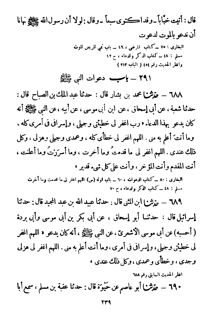 688 - حَدَّثَنَا مُحَمَّدُ بْنُ بَشَّارٍ قَالَ: حَدَّثَنَا عَبْدُ الْمَلِكِ بْنُ الصَّبَّاحِ قَالَ: حَدَّثَنَا شُعْبَةُ، عَنْ أَبِي إِسْحَاقَ، عَنِ ابْنِ أَبِي مُوسَى، عَنْ أَبِيهِ، عَنِ النَّبِيِّ صَلَّى اللهُ عَلَيْهِ وَسَلَّمَ، أَنَّهُ كَانَ يَدْعُو بِهَذَا الدُّعَاءِ: «§رَبِّ اغْفِرْ لِي خَطِيئَتِي وَجَهْلِي، وَإِسْرَافِي فِي أَمْرِي كُلِّهِ، وَمَا أَنْتَ أَعْلَمُ بِهِ مِنِّي، اللَّهُمَّ اغْفِرْ لِي خَطَئِي كُلَّهُ، وَعَمْدِي وَجَهْلِي وَهَزْلِي، وَكُلُّ ذَلِكَ عِنْدِي. اللَّهُمَّ اغْفِرْ لِي مَا قَدَّمْتُ وَمَا أَخَّرْتُ، وَمَا أَسْرَرْتُ وَمَا أَعْلَنْتُ، أَنْتَ الْمُقَدِّمُ وَأَنْتَ الْمُؤَخِّرُ، وَأَنْتَ عَلَى كُلِّ شَيْءٍ قَدِيرٌ» Kصحيح