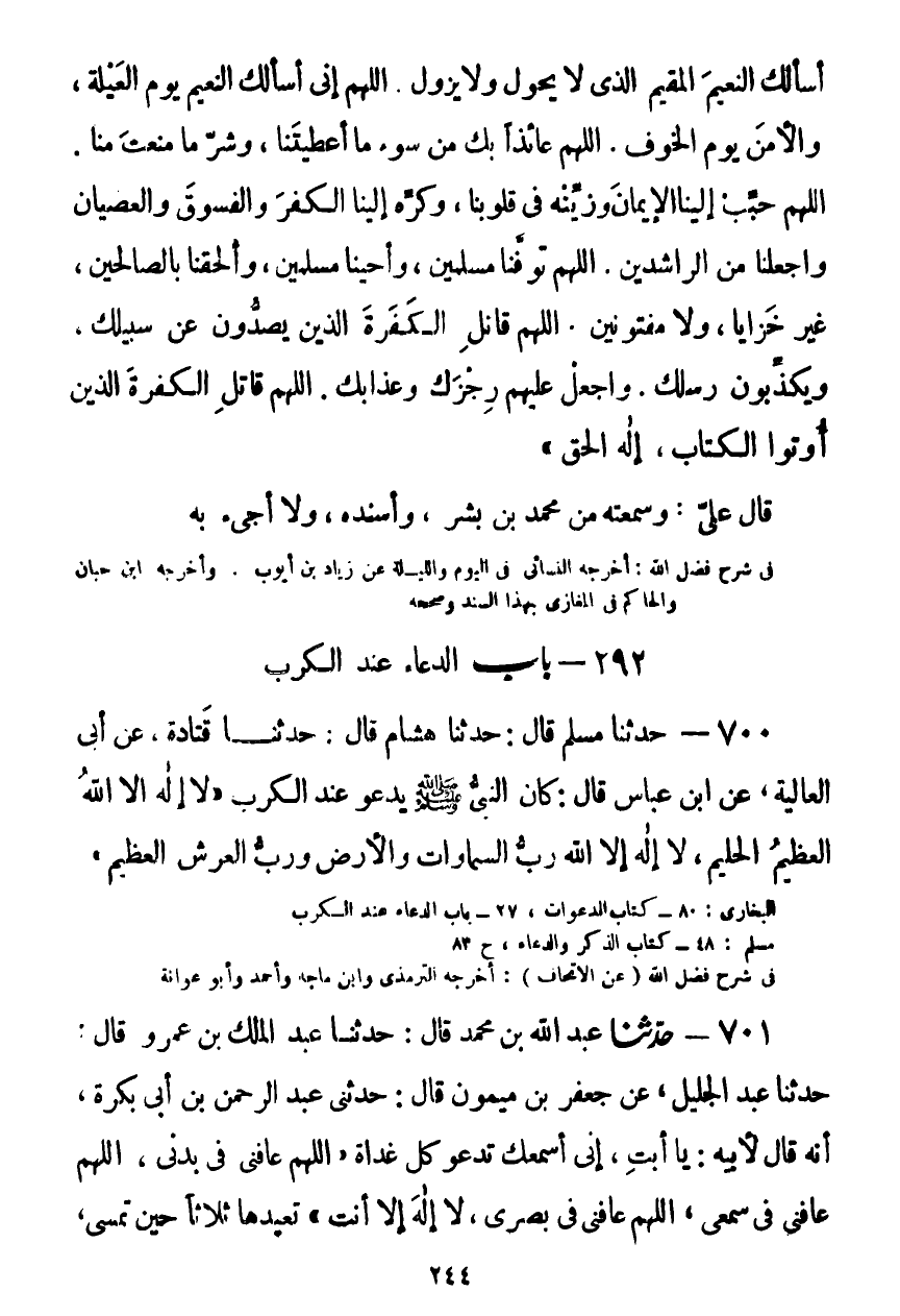 700 - حَدَّثَنَا مُسْلِمٌ قَالَ: حَدَّثَنَا هِشَامٌ قَالَ: حَدَّثَنَا قَتَادَةُ، عَنْ أَبِي الْعَالِيَةِ، عَنِ ابْنِ عَبَّاسٍ قَالَ: كَانَ النَّبِيُّ صَلَّى اللهُ عَلَيْهِ وَسَلَّمَ يَدْعُو عِنْدَ الْكَرْبِ: «§لَا إِلَهَ إِلَّا اللَّهُ الْعَظِيمُ الْحَلِيمُ، لَا إِلَهَ إِلَّا اللَّهُ رَبُّ السَّمَاوَاتِ وَالْأَرْضِ وَرَبِّ الْعَرْشِ الْعَظِيمِ» Kصحيح