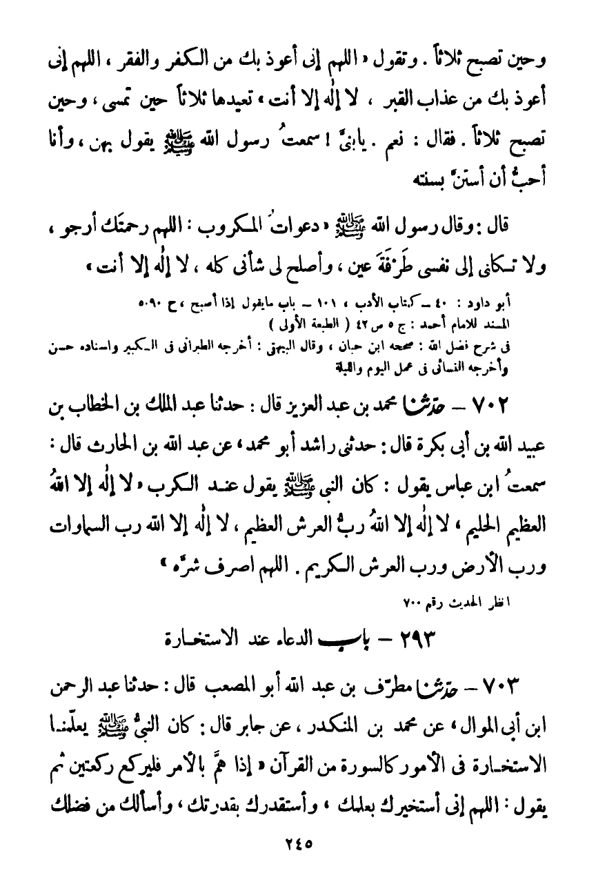 703 - حَدَّثَنَا مُطَرِّفُ بْنُ عَبْدِ اللَّهِ أَبُو الْمُصْعَبِ قَالَ: حَدَّثَنَا عَبْدُ الرَّحْمَنِ بْنُ أَبِي الْمَوَالِ، عَنْ مُحَمَّدِ بْنِ الْمُنْكَدِرِ، عَنْ جَابِرٍ قَالَ: كَانَ النَّبِيُّ صَلَّى اللهُ عَلَيْهِ وَسَلَّمَ يُعَلِّمُنَا الِاسْتِخَارَةَ فِي الْأُمُورِ كَالسُّورَةِ مِنَ الْقُرْآنِ: " إِذَا هَمَّ بِالْأَمْرِ فَلْيَرْكَعْ رَكْعَتَيْنِ ثُمَّ يَقُولُ: §اللَّهُمَّ إِنِّي أَسْتَخِيرُكَ بِعِلْمِكَ، وَأَسْتَقْدِرُكَ بِقُدْرَتِكَ، وَأَسْأَلُكَ مِنْ فَضْلِكَ الْعَظِيمِ، فَإِنَّكَ تَقْدِرُ وَلَا أَقْدِرُ، وَتَعْلَمُ وَلَا أَعْلَمُ، وَأَنْتَ عَلَّامُ الْغُيُوبِ. اللَّهُمَّ إِنْ كُنْتَ تَعْلَمُ أَنَّ هَذَا الْأَمْرَ خَيْرٌ لِي فِي دِينِي، وَمَعَاشِي، وَعَاقِبَةِ أمري - أَوْ قَالَ: فِي عَاجِلِ أَمْرِي وَآجِلِهِ - فَاقْدُرْهُ لِي، وَإِنْ كُنْتَ تَعْلَمُ أَنَّ هَذَا الْأَمْرَ شَرٌّ لِي فِي دِينِي، وَمَعَاشِي، وَعَاقِبَةِ - أَوْ قَالَ: عَاجِلِ - أَمْرِي وَآجِلِهِ فَاصْرِفْهُ عَنِّي وَاصْرِفْنِي عَنْهُ، وَاقْدُرْ لِيَ الْخَيْرَ حَيْثُ كَانَ، ثُمَّ رَضِّنِي، وَيُسَمِّي حَاجَتَهُ "Kصحيح