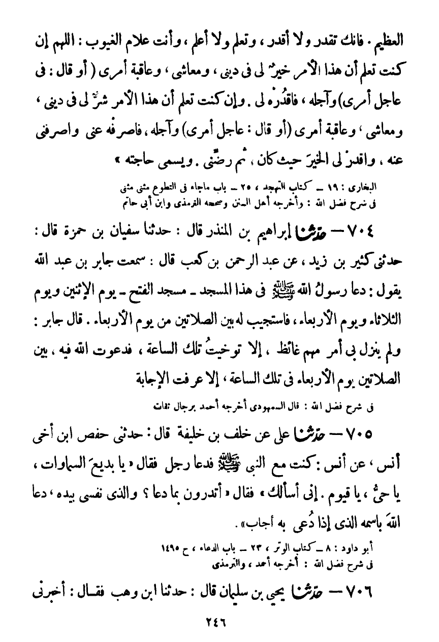 704 - حَدَّثَنَا إِبْرَاهِيمُ بْنُ الْمُنْذِرِ قَالَ: حَدَّثَنَا سُفْيَانُ بْنُ حَمْزَةَ قَالَ: حَدَّثَنِي كَثِيرُ بْنُ زَيْدٍ، عَنْ عَبْدِ الرَّحْمَنِ بْنِ كَعْبٍ قَالَ: سَمِعْتُ جَابِرَ بْنَ عَبْدِ اللَّهِ يَقُولُ: §دَعَا رَسُولُ اللَّهِ صَلَّى اللهُ عَلَيْهِ وَسَلَّمَ فِي هَذَا الْمَسْجِدِ، مَسْجِدِ الْفَتْحِ، يَوْمَ الِاثْنَيْنِ وَيَوْمَ الثُّلَاثَاءِ وَيَوْمَ الْأَرْبِعَاءِ، فَاسْتُجِيبَ لَهُ بَيْنَ الصَّلَاتَيْنِ مِنْ يَوْمِ الْأَرْبِعَاءِ قَالَ جَابِرٌ: وَلَمْ يَنْزِلْ بِي أَمْرٌ مُهِمٌّ غائِظٌ إِلَّا تَوَخَّيْتُ تِلْكَ السَّاعَةَ، فَدَعَوْتُ اللَّهَ فِيهِ بَيْنَ الصَّلَاتَيْنِ يَوْمَ الْأَرْبِعَاءِ فِي تِلْكَ السَّاعَةِ، إِلَّا عَرَفْتُ الْإِجَابَةَKحسن
