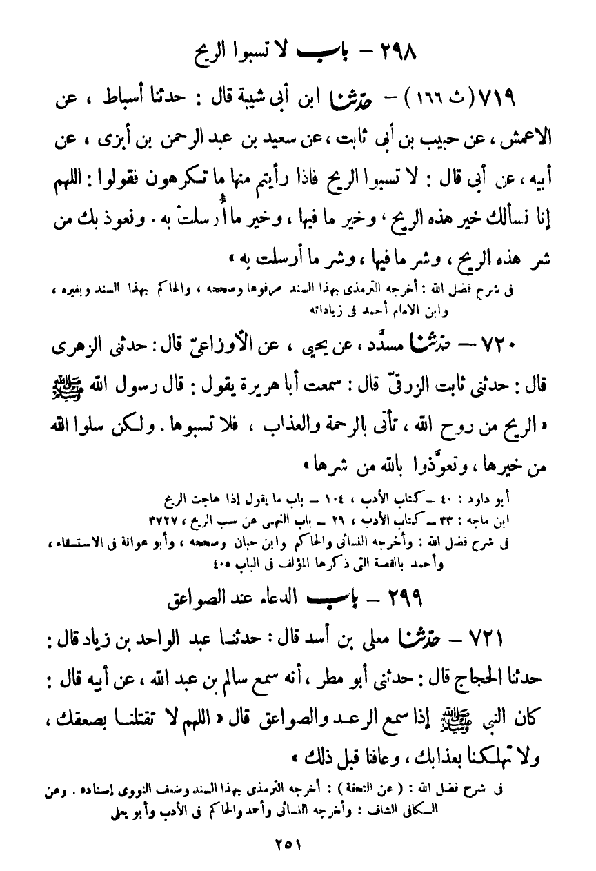 719 - حَدَّثَنَا ابْنُ أَبِي شَيْبَةَ قَالَ: حَدَّثَنَا أَسْبَاطٌ، عَنِ الْأَعْمَشِ، عَنْ حَبِيبِ بْنِ أَبِي ثَابِتٍ، عَنْ سَعِيدِ بْنِ عَبْدِ الرَّحْمَنِ بْنِ أَبْزَى، عَنْ أَبِيهِ، عَنْ أَبِي قَالَ: لَا تَسُبُّوا الرِّيحَ، فَإِذَا رَأَيْتُمْ مِنْهَا مَا تَكْرَهُونَ فَقُولُوا: §اللَّهُمَّ إِنَّا نَسْأَلُكَ خَيْرَ هَذِهِ الرِّيحِ، وَخَيْرَ مَا فِيهَا، وَخَيْرَ مَا أُرْسِلَتْ بِهِ، وَنَعُوذُ بِكَ مِنْ شَرِّ هَذِهِ الرِّيحِ، وَشَرِّ مَا فِيهَا، وَشَرِّ مَا أُرْسِلَتْ بِهِKصحيح