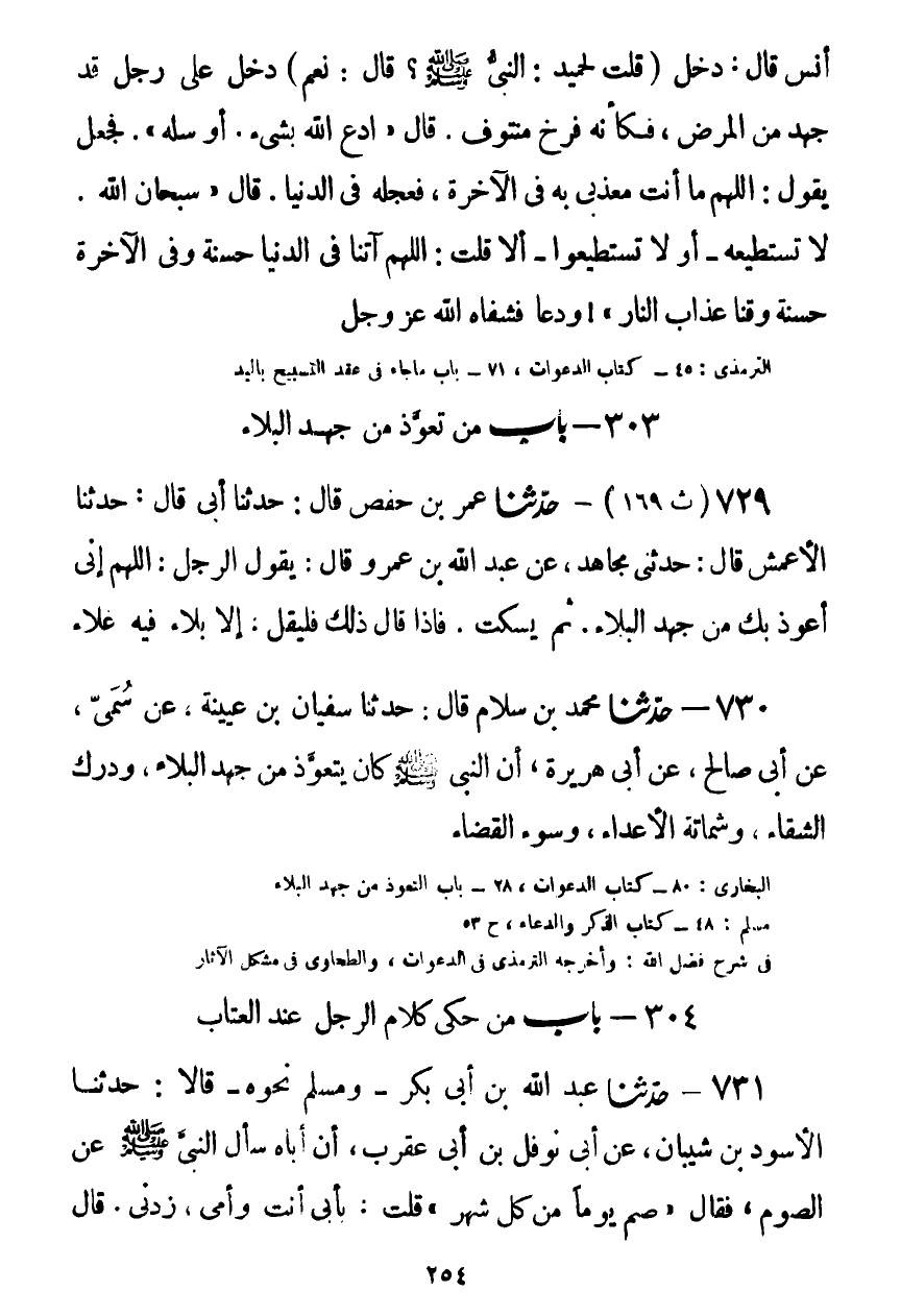 730 - حَدَّثَنَا مُحَمَّدُ بْنُ سَلَّامٍ قَالَ: حَدَّثَنَا سُفْيَانُ بْنُ عُيَيْنَةَ، عَنْ سُمَيٍّ، عَنْ أَبِي صَالِحٍ، عَنْ أَبِي هُرَيْرَةَ، أَنَّ النَّبِيَّ صَلَّى اللهُ عَلَيْهِ وَسَلَّمَ كَانَ §يَتَعَوَّذُ مِنْ جَهْدِ الْبَلَاءِ، وَدَرَكِ الشَّقَاءِ، وَشَمَاتَةِ الْأَعْدَاءِ، وَسُوءِ الْقَضَاءِKصحيح