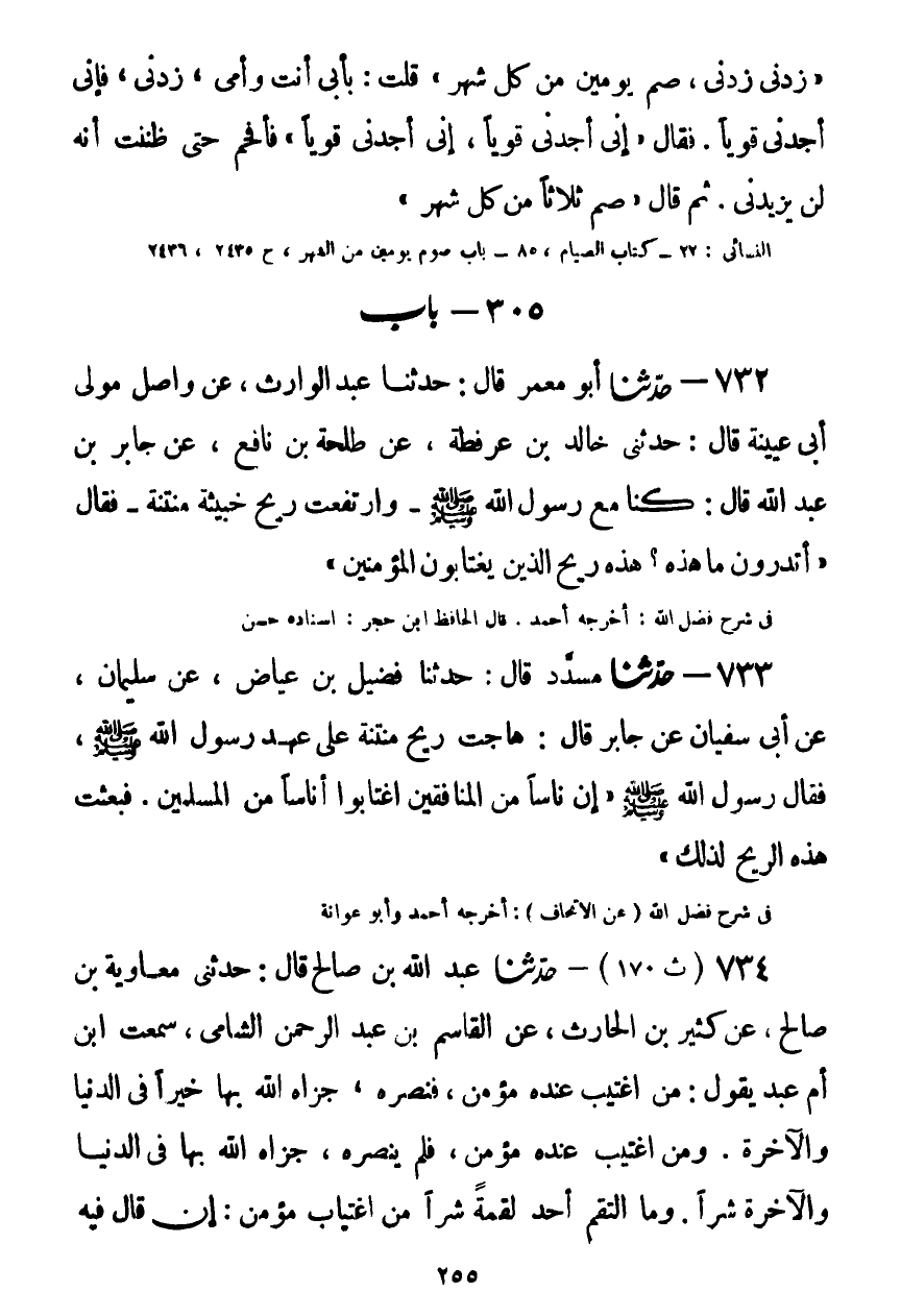 732 - حَدَّثَنَا أَبُو مَعْمَرٍ قَالَ: حَدَّثَنَا عَبْدُ الْوَارِثِ، عَنْ وَاصِلٍ مَوْلَى أَبِي عُيَيْنَةَ قَالَ: حَدَّثَنِي خَالِدُ بْنُ عُرْفُطَةَ، عَنْ طَلْحَةَ بْنِ نَافِعٍ، عَنْ جَابِرِ بْنِ عَبْدِ اللَّهِ قَالَ: كُنَّا مَعَ رَسُولِ اللَّهِ صَلَّى اللهُ عَلَيْهِ وَسَلَّمَ وَارْتَفَعَتْ رِيحٌ خَبِيثَةٌ مُنْتِنَةٌ، فَقَالَ: «أَتَدْرُونَ مَا هَذِهِ؟ §هَذِهِ رِيحُ الَّذِينَ يَغْتَابُونَ الْمُؤْمِنِينَ» Kحسن