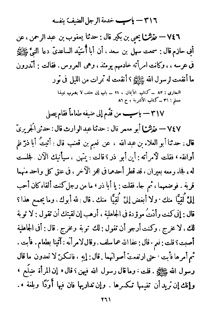 747 - حَدَّثَنَا أَبُو مَعْمَرٍ قَالَ: حَدَّثَنَا عَبْدُ الْوَارِثِ قَالَ: حَدَّثَنِي الْجُرَيْرِيُّ قَالَ: حَدَّثَنَا أَبُو الْعَلَاءِ بْنُ عَبْدِ اللَّهِ، عَنْ نُعَيْمِ بْنِ قَعْنَبٍ قَالَ: أَتَيْتُ أَبَا ذَرٍّ فَلَمْ أُوَافِقْهُ، فَقُلْتُ لِامْرَأَتِهِ: أَيْنَ أَبُو ذَرٍّ؟ قَالَتْ: يَمْتَهِنُ، سَيَأْتِيكَ الْآنَ، فَجَلَسْتُ لَهُ، فَجَاءَ وَمَعَهُ بَعِيرَانِ، قَدْ قَطَرَ أَحَدَهُمَا بِعَجُزِ الْآخَرِ، فِي عُنُقِ كُلِّ وَاحِدٍ مِنْهُمَا قِرْبَةٌ، فَوَضَعَهُمَا ثُمَّ جَاءَ، فَقُلْتُ: يَا أَبَا ذَرٍّ، مَا مِنْ رَجُلٍ كُنْتُ أَلْقَاهُ كَانَ أَحَبَّ إِلَيَّ لُقْيًا مِنْكَ، وَلَا أَبْغَضَ إِلَيَّ لُقْيًا مِنْكَ، قَالَ: لِلَّهِ أَبُوكَ، وَمَا جَمَعَ هَذَا؟ قَالَ: إِنِّي كُنْتُ وَأَدْتُ مَوْءُودَةً فِي الْجَاهِلِيَّةِ أَرْهَبُ إِنْ لَقِيتُكَ أَنْ تَقُولَ: لَا تَوْبَةَ لَكَ، لَا مَخْرَجَ لَكَ، وَكُنْتُ أَرْجُو أَنْ تَقُولَ: لَكَ تَوْبَةٌ وَمَخْرَجٌ، قَالَ: أَفِي الْجَاهِلِيَّةِ أَصَبْتَ؟ قُلْتُ: نَعَمْ، قَالَ: عَفَا اللَّهُ عَمَّا سَلَفَ. وَقَالَ لِامْرَأَتِهِ: آتِينَا بِطَعَامٍ، فَأَبَتَ، ثُمَّ أَمَرَهَا فَأَبَتَ، حَتَّى ارْتَفَعَتْ أَصْوَاتُهُمَا، قَالَ: إِيهِ، فَإِنَّكُنَّ لَا تَعْدُونَ مَا قَالَ رَسُولُ اللَّهِ صَلَّى اللهُ عَلَيْهِ وَسَلَّمَ، قُلْتُ: وَمَا قَالَ رَسُولُ اللَّهِ فِيهِنَّ؟ قَالَ: «إِنَّ §الْمَرْأَةَ خُلِقَتْ مِنْ ضِلَعٍ، وَإِنَّكَ إِنْ تُرِدْ أَنْ تُقِيمَهَا تَكْسِرُهَا، وَإِنْ تُدَارِهَا فَإِنَّ فِيهَا أَوَدًا وَبُلْغَةً» ، فَوَلَّتْ فَجَاءَتْ بِثَرِيدَةٍ كَأَنَّهَا قَطَاةٌ، فَقَالَ: كُلْ وَلَا أَهُولَنَّكَ فَإِنِّي صَائِمٌ، ثُمَّ قَامَ يُصَلِّي، فَجَعَلَ يُهَذِّبُ الرُّكُوعَ، ثُمَّ انْفَتَلَ فَأَكَلَ، فَقُلْتُ: إِنَّا لِلَّهِ، مَا كُنْتُ أَخَافُ أَنْ تَكْذِبَنِي، قَالَ: لِلَّهِ أَبُوكَ، مَا كَذَبْتُ مُنْذُ لَقِيتَنِي، قُلْتُ: أَلَمْ تُخْبِرْنِي أَنَّكَ صَائِمٌ؟ قَالَ: بَلَى، إِنِّي صُمْتُ مِنْ هَذَا الشَّهْرِ ثَلَاثَةَ أَيَّامٍ فَكُتِبَ لِي أَجْرُهُ، وَحَلَّ لِيَ الطَّعَامُKحسن