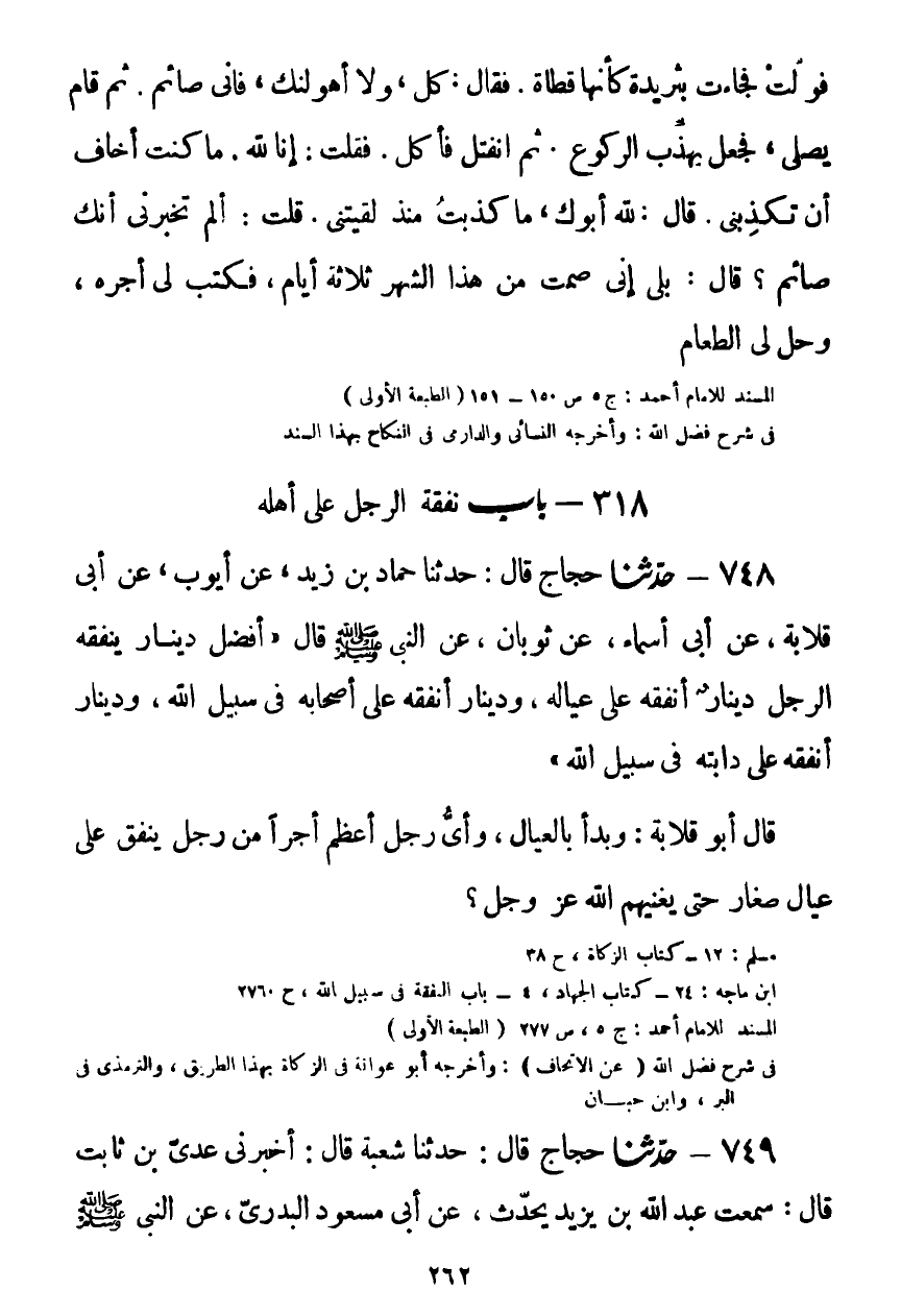 748 - حَدَّثَنَا حَجَّاجٌ قَالَ: حَدَّثَنَا حَمَّادُ بْنُ زَيْدٍ، عَنْ أَيُّوبَ، عَنْ أَبِي قِلَابَةَ، عَنْ أَبِي أَسْمَاءَ، عَنْ ثَوْبَانَ، عَنِ النَّبِيِّ صَلَّى اللهُ عَلَيْهِ وَسَلَّمَ قَالَ: «إِنَّ §مِنْ أَفْضَلِ دِينَارٍ أَنْفَقَهُ الرَّجُلُ عَلَى عِيَالِهِ، وَدِينَارٌ أَنْفَقَهُ عَلَى أَصْحَابِهِ فِي سَبِيلِ اللَّهِ، وَدِينَارٌ أَنْفَقَهُ عَلَى دَابَّتِهِ فِي سَبِيلِ اللَّهِ» قَالَ أَبُو قِلَابَةَ: وَبَدَأَ بِالْعِيَالِ، وَأَيُّ رَجُلٍ أَعْظَمُ أَجْرًا مِنْ رَجُلٍ يُنْفِقُ عَلَى عِيَالٍ صِغَارٍ حَتَّى يُغْنِيَهُمُ اللَّهُ عَزَّ وَجَلَّ؟ Kصحيح