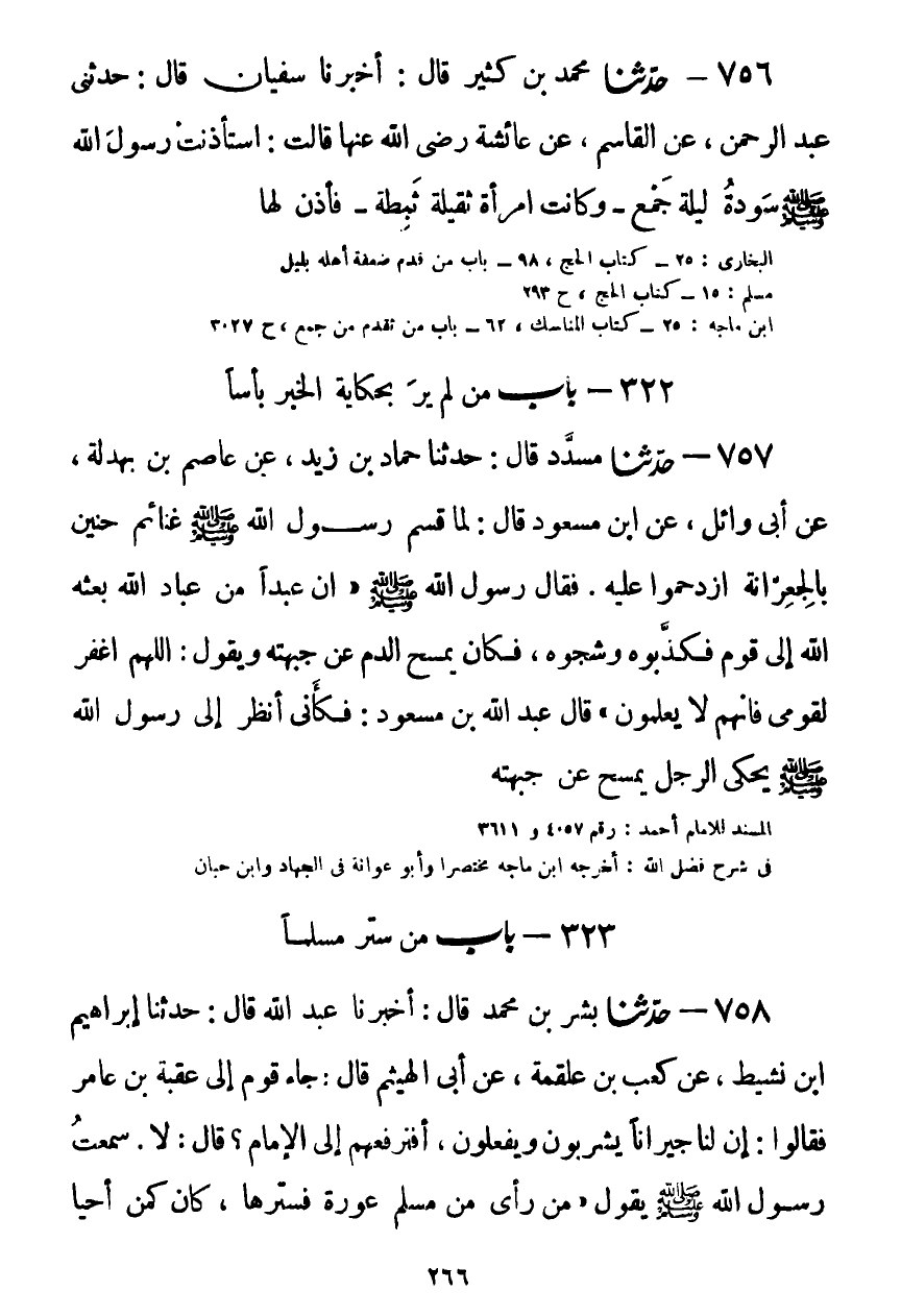756 - حَدَّثَنَا مُحَمَّدُ بْنُ كَثِيرٍ قَالَ: أَخْبَرَنَا سُفْيَانُ قَالَ: حَدَّثَنِي عَبْدُ الرَّحْمَنِ، عَنِ الْقَاسِمِ، عَنْ عَائِشَةَ رَضِيَ اللَّهُ عَنْهَا قَالَتْ: §اسْتَأْذَنَتْ رَسُولَ اللَّهِ صَلَّى اللهُ عَلَيْهِ وَسَلَّمَ سَوْدَةُ لَيْلَةَ جَمْعٍ - وَكَانَتِ امْرَأَةً ثَقِيلَةً ثَبِطَةً - فَأَذِنَ لَهَاKصحيح