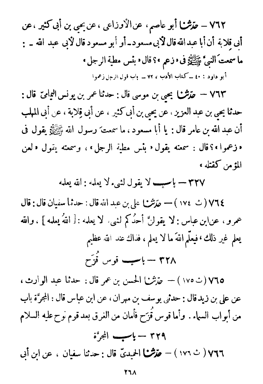 763 - حَدَّثَنَا يَحْيَى بْنُ مُوسَى قَالَ: حَدَّثَنَا عُمَرُ بْنُ يُونُسَ الْيَمَامِيُّ قَالَ: حَدَّثَنَا يَحْيَى بْنُ عَبْدِ الْعَزِيزِ، عَنْ يَحْيَى بْنِ أَبِي كَثِيرٍ، عَنْ أَبِي قِلَابَةَ، عَنْ أَبِي الْمُهَلَّبِ أَنَّ عَبْدَ اللَّهِ بْنَ عَامِرٍ قَالَ: يَا أَبَا مَسْعُودٍ، مَا سَمِعْتَ رَسُولَ اللَّهِ صَلَّى اللهُ عَلَيْهِ وَسَلَّمَ يَقُولُ فِي «زَعَمُوا» ؟ قَالَ: سَمِعْتُهُ يَقُولُ: «§بِئْسَ مَطِيَّةُ الرَّجُلِ» Kصحيح