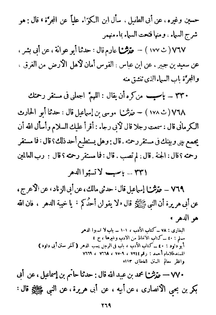 769 - حَدَّثَنَا إِسْمَاعِيلُ قَالَ: حَدَّثَنِي مَالِكٌ، عَنْ أَبِي الزِّنَادِ، عَنِ الْأَعْرَجِ، عَنْ أَبِي هُرَيْرَةَ، أَنَّ النَّبِيَّ صَلَّى اللهُ عَلَيْهِ وَسَلَّمَ قَالَ: " §لَا يَقُولَنَّ أَحَدُكُمْ: يَا خَيْبَةَ الدَّهْرِ، فَإِنَّ اللَّهَ هُوَ الدَّهْرُ "Kصحيح
