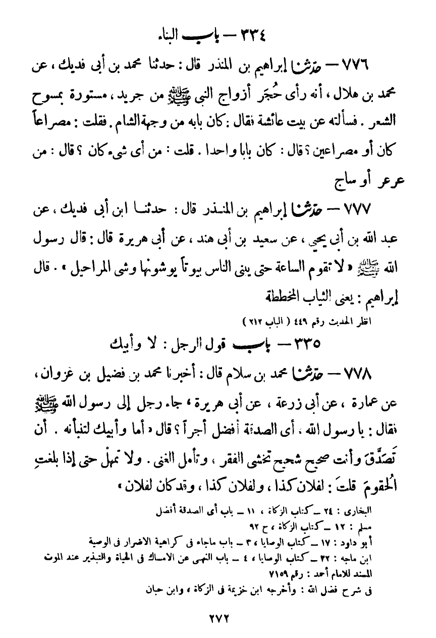 777 - حَدَّثَنَا إِبْرَاهِيمُ بْنُ الْمُنْذِرِ قَالَ: حَدَّثَنَا ابْنُ أَبِي فُدَيْكٍ، عَنْ عَبْدِ اللَّهِ بْنِ أَبِي يَحْيَى، عَنْ سَعِيدِ بْنِ أَبِي هِنْدَ، عَنْ أَبِي هُرَيْرَةَ قَالَ: قَالَ رَسُولُ اللَّهِ صَلَّى اللهُ عَلَيْهِ وَسَلَّمَ: «§لَا تَقُومُ السَّاعَةُ حَتَّى يَبْنِيَ النَّاسُ بُيُوتًا يُوشُونَهَا وَشْيَ الْمَرَاحِيلِ» قَالَ إِبْرَاهِيمُ: يَعْنِي الثِّيَابَ الْمُخَطَّطَةَKصحيح