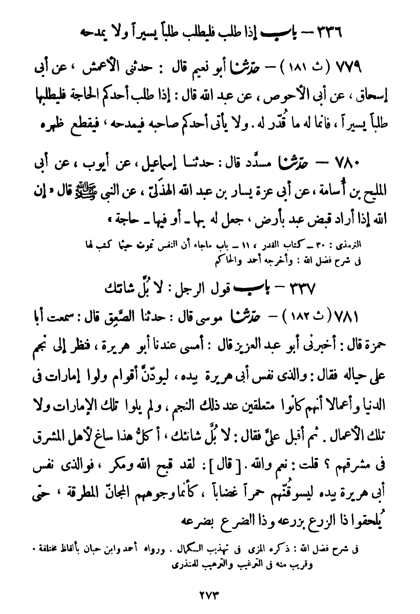 779 - حَدَّثَنَا أَبُو نُعَيْمٍ قَالَ: حَدَّثَنِي الْأَعْمَشُ، عَنْ أَبِي إِسْحَاقَ، عَنْ أَبِي الْأَحْوَصِ، عَنْ عَبْدِ اللَّهِ قَالَ: §إِذَا طَلَبَ أَحَدُكُمُ الْحَاجَةَ فَلْيَطْلُبْهَا طَلَبًا يَسِيرًا، فَإِنَّمَا لَهُ مَا قُدِّرَ لَهُ، وَلَا يَأْتِي أَحَدُكُمْ صَاحِبَهُ فَيَمْدَحَهُ، فَيَقْطَعَ ظَهْرَهُKصحيح