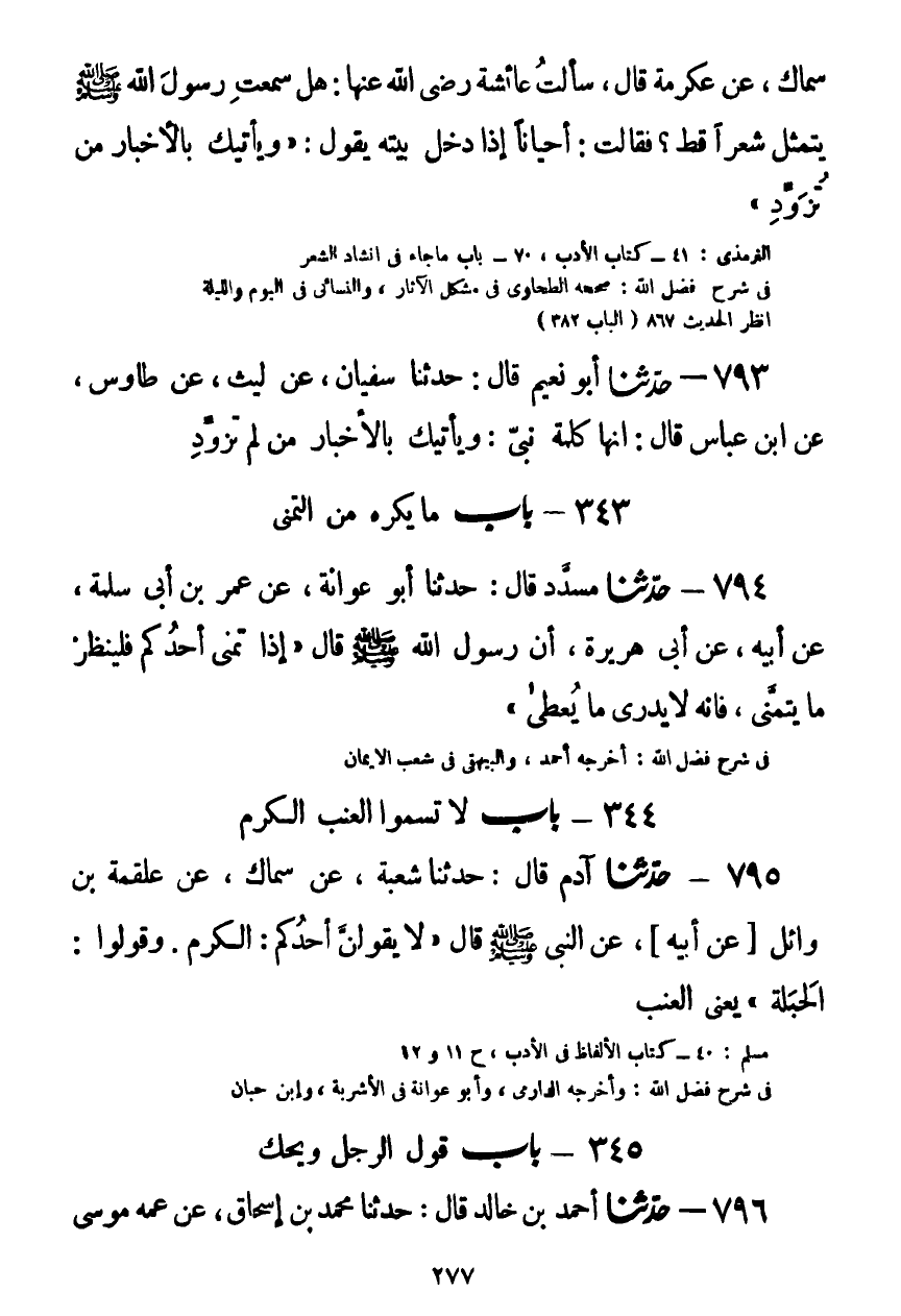 795 - حَدَّثَنَا آدَمُ قَالَ: حَدَّثَنَا شُعْبَةُ، عَنْ سِمَاكٍ، عَنْ عَلْقَمَةَ بْنِ وَائِلٍ، عَنْ أَبِيهِ، عَنِ النَّبِيِّ صَلَّى اللهُ عَلَيْهِ وَسَلَّمَ قَالَ: " §لَا يَقُولَنَّ أَحَدُكُمُ: الْكَرْمَ، وَقُولُوا الْحَبَلَةَ "، يَعْنِي: الْعِنَبَKصحيح