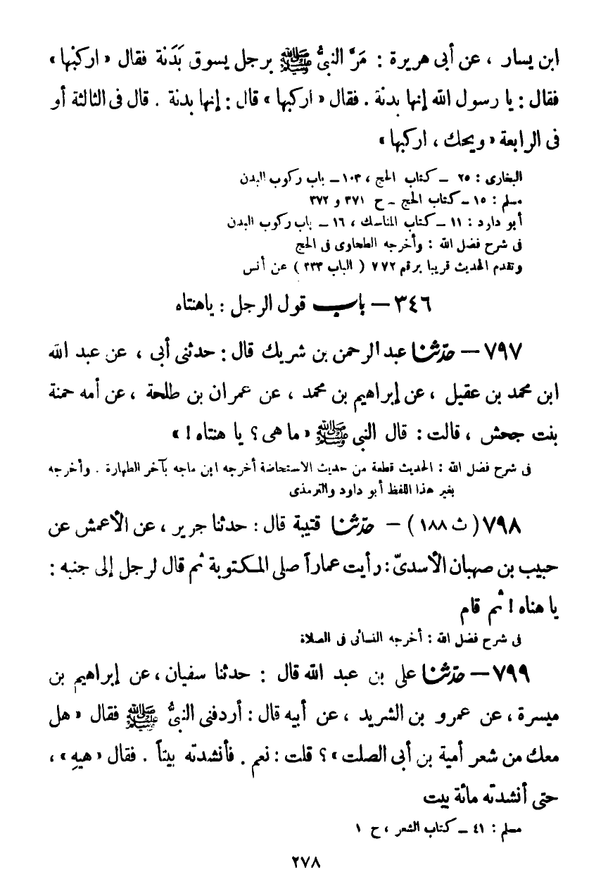 799 - حَدَّثَنَا عَلِيُّ بْنُ عَبْدِ اللَّهِ قَالَ: حَدَّثَنَا سُفْيَانُ، عَنْ إِبْرَاهِيمَ بْنِ مَيْسَرَةَ، عَنْ عَمْرِو بْنِ الشَّرِيدِ، عَنْ أَبِيهِ قَالَ: أَرْدَفَنِي النَّبِيُّ صَلَّى اللهُ عَلَيْهِ وَسَلَّمَ فَقَالَ: «§هَلْ مَعَكَ مِنْ شِعْرِ أُمَيَّةَ بْنِ أَبِي الصَّلْتِ؟» قُلْتُ: نَعَمْ. فَأَنْشَدْتُهُ بَيْتًا، فَقَالَ: «هِيهِ» ، حَتَّى أَنْشَدْتُهُ مِائَةَ بَيْتٍKصحيح