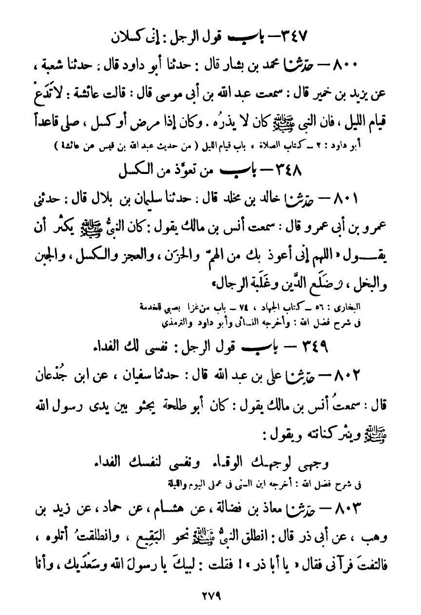 802 - حَدَّثَنَا عَلِيُّ بْنُ عَبْدِ اللَّهِ قَالَ: حَدَّثَنَا سُفْيَانُ، عَنِ ابْنِ جُدْعَانَ قَالَ: سَمِعْتُ أَنَسَ بْنَ مَالِكٍ يَقُولُ: كَانَ أَبُو طَلْحَةَ يَجْثُو بَيْنَ يَدَيْ رَسُولِ اللَّهِ صَلَّى اللهُ عَلَيْهِ وَسَلَّمَ وَيَنْثُرُ كِنَانَتَهُ وَيَقُولُ: §وَجْهِي لِوَجْهِكَ الْوِقَاءُ، وَنَفْسِي لِنَفْسِكَ الْفِدَاءُKضعيف