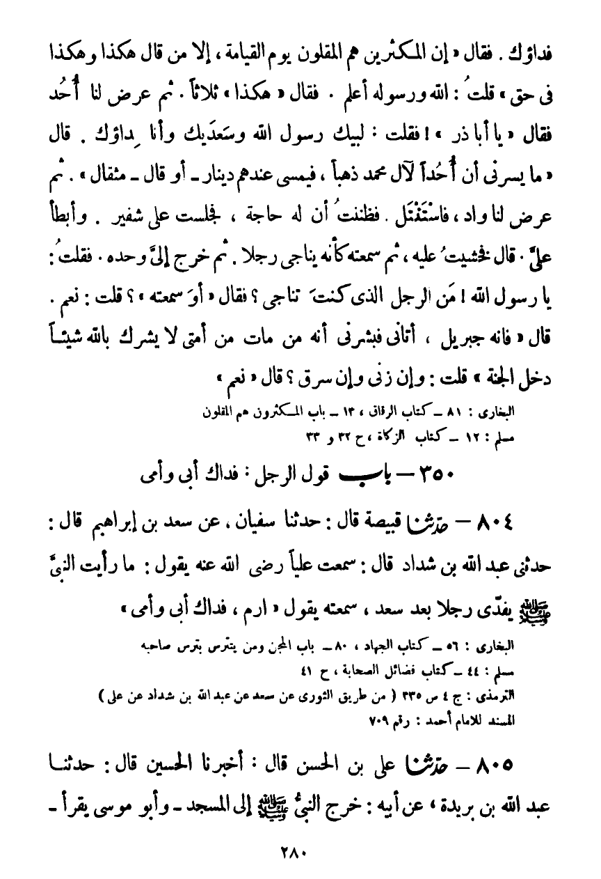 804 - حَدَّثَنَا قَبِيصَةُ قَالَ: حَدَّثَنَا سُفْيَانُ، عَنْ سَعْدِ بْنِ إِبْرَاهِيمَ قَالَ: حَدَّثَنِي عَبْدُ اللَّهِ بْنُ شَدَّادٍ قَالَ: سَمِعْتُ عَلِيًّا رَضِيَ اللَّهُ عَنْهُ يَقُولُ: مَا رَأَيْتُ النَّبِيَّ صَلَّى اللهُ عَلَيْهِ وَسَلَّمَ يُفَدِّي رَجُلًا بَعْدَ سَعْدٍ، سَمِعْتُهُ يَقُولُ: «§ارْمِ، فِدَاكَ أَبِي وَأُمِّي» Kصحيح
