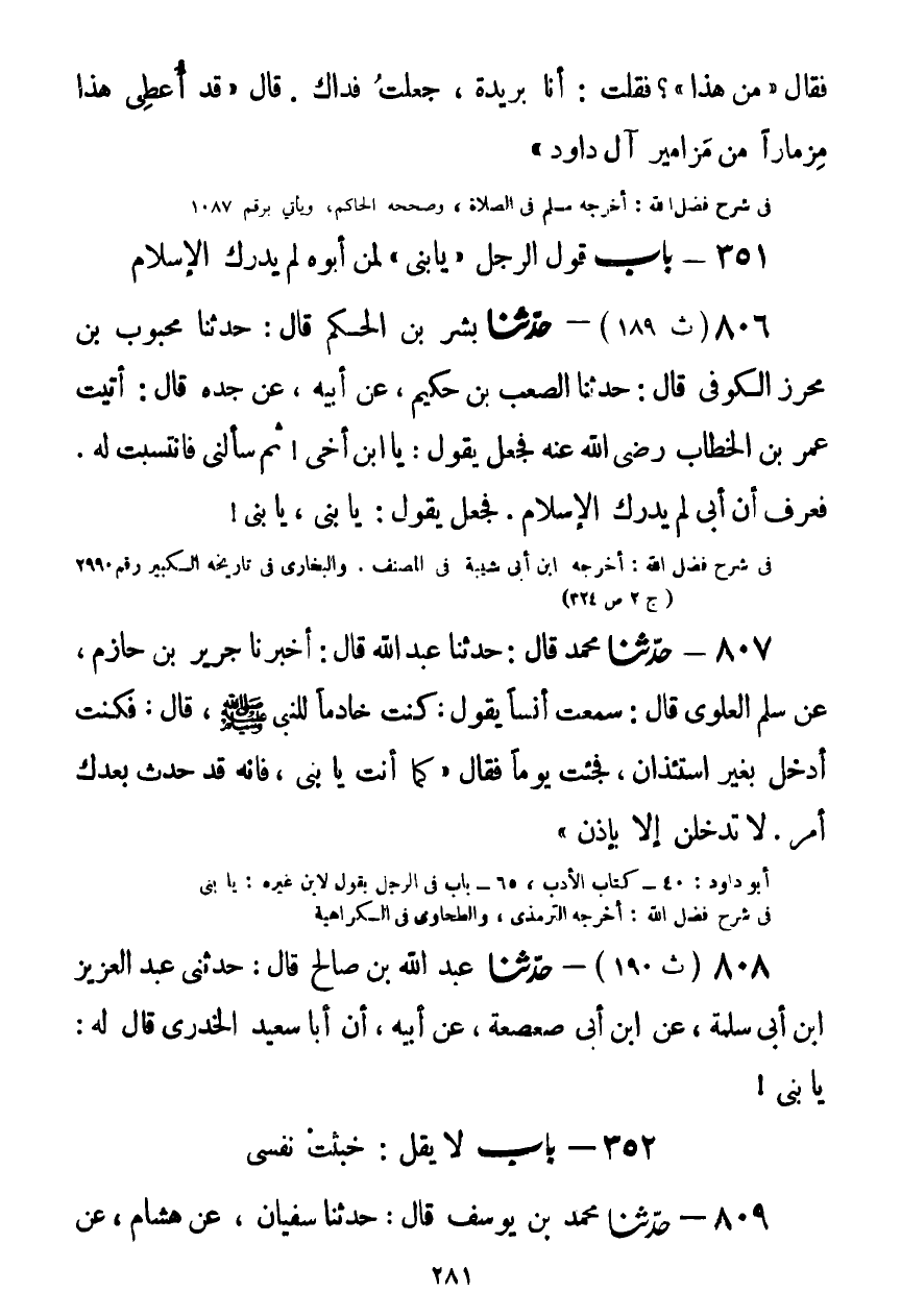808 - حَدَّثَنَا عَبْدُ اللَّهِ بْنُ صَالِحٍ قَالَ: حَدَّثَنِي عَبْدُ الْعَزِيزِ بْنُ أَبِي سَلَمَةَ، عَنِ ابْنِ أَبِي صَعْصَعَةَ، عَنْ أَبِيهِ، أَنَّ أَبَا سَعِيدٍ الْخُدْرِيَّ قَالَ لَهُ: §يَا بُنَيَّKصحيح الإسناد موقوف