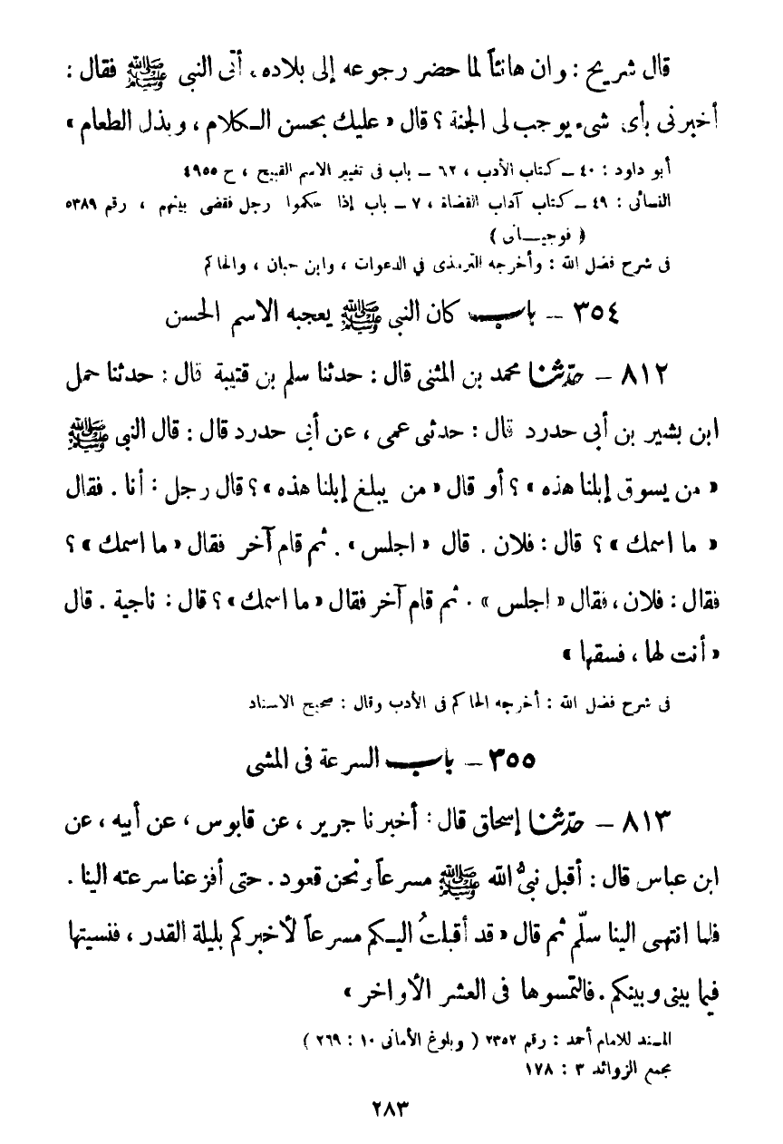 812 - حَدَّثَنَا مُحَمَّدُ بْنُ الْمُثَنَّى قَالَ: حَدَّثَنَا سَلْمُ بْنُ قُتَيْبَةَ قَالَ: حَدَّثَنَا حَمْلُ بْنُ بَشِيرِ بْنِ أَبِي حَدْرَدٍ قَالَ: حَدَّثَنِي عَمِّي، عَنْ أَبِي حَدْرَدٍ قَالَ: قَالَ النَّبِيُّ صَلَّى اللهُ عَلَيْهِ وَسَلَّمَ: «مَنْ يَسُوقُ إِبِلَنَا هَذِهِ؟» أَوْ قَالَ: «مَنْ يُبَلِّغُ إِبِلَنَا هَذِهِ؟» قَالَ رَجُلٌ: أَنَا، فَقَالَ: «مَا اسْمُكَ؟» قَالَ: فُلَانٌ، قَالَ: «اجْلِسْ» ، ثُمَّ قَامَ آخَرُ، فَقَالَ: «مَا اسْمُكَ؟» قَالَ: فُلَانٌ، فقَالَ: «اجْلِسْ» ، ثُمَّ قَامَ آخَرُ، فَقَالَ: «مَا اسْمُكَ؟» قَالَ: نَاجِيَةُ، قَالَ: «§أَنْتَ لَهَا، فَسُقْهَا» Kضعيف