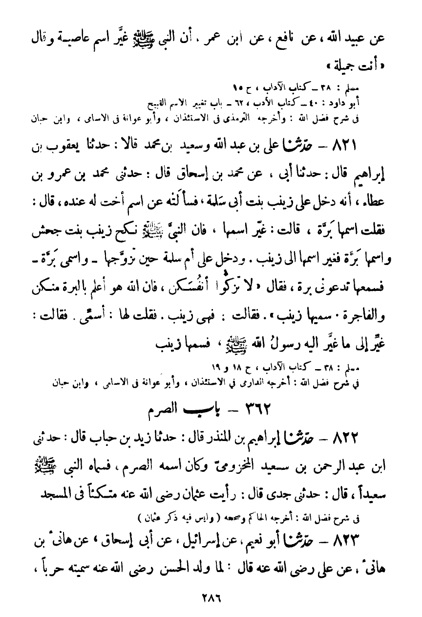 821 - حَدَّثَنَا عَلِيُّ بْنُ عَبْدِ اللَّهِ، وَسَعِيدُ بْنُ مُحَمَّدٍ، قَالَا: حَدَّثَنَا يَعْقُوبُ بْنُ إِبْرَاهِيمَ قَالَ: حَدَّثَنَا أَبِي، عَنْ مُحَمَّدِ بْنِ إِسْحَاقَ قَالَ: حَدَّثَنِي مُحَمَّدُ بْنُ عَمْرِو بْنِ عَطَاءٍ، أَنَّهُ دَخَلَ عَلَى زَيْنَبَ بِنْتِ أَبِي سَلَمَةَ، فَسَأَلَتْهُ عَنِ اسْمِ أُخْتٍ لَهُ عِنْدَهُ؟ قَالَ: فَقُلْتُ: اسْمُهَا بَرَّةُ، قَالَتْ: غَيِّرِ اسْمَهَا، فَإِنَّ النَّبِيَّ صَلَّى اللهُ عَلَيْهِ وَسَلَّمَ نَكَحَ زَيْنَبَ بِنْتَ جَحْشٍ وَاسْمُهَا بَرَّةُ، فَغَيَّرَ اسْمَهَا إِلَى زَيْنَبَ، وَدَخَلَ عَلَى أُمِّ سَلَمَةَ حِينَ تَزَوَّجَهَا، وَاسْمِي بَرَّةُ، فَسَمِعَهَا تَدْعُونِي: بَرَّةَ، فَقَالَ: «§لَا تُزَكُّوا أَنْفُسَكُمْ، فَإِنَّ اللَّهَ هُوَ أَعْلَمُ بِالْبَرَّةِ مِنْكُنَّ وَالْفَاجِرَةِ، سَمِّيهَا زَيْنَبَ» ، فَقَالَتْ: فَهِيَ زَيْنَبُ، فَقُلْتُ لَهَا: سَمِّي، فَقَالَتْ: غَيِّرْهُ إِلَى مَا غَيَّرَ إِلَيْهِ رَسُولُ اللَّهِ صَلَّى اللهُ عَلَيْهِ وَسَلَّمَ، فَسَمِّهَا زَيْنَبَKصحيح