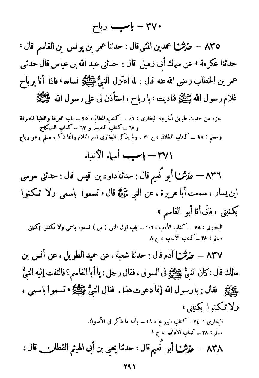 837 - حَدَّثَنَا آدَمُ قَالَ: حَدَّثَنَا شُعْبَةُ، عَنْ حُمَيْدٍ الطَّوِيلِ، عَنْ أَنَسِ بْنِ مَالِكٍ قَالَ: كَانَ النَّبِيُّ صَلَّى اللهُ عَلَيْهِ وَسَلَّمَ فِي السُّوقِ، فَقَالَ رَجُلٌ: يَا أَبَا الْقَاسِمِ، فَالْتَفَتَ إِلَيْهِ النَّبِيُّ صَلَّى اللهُ عَلَيْهِ وَسَلَّمَ، فَقَالَ: يَا رَسُولَ اللَّهِ، إِنَّمَا دَعَوْتُ هَذَا، فَقَالَ النَّبِيُّ صَلَّى اللهُ عَلَيْهِ وَسَلَّمَ: «§سَمُّوا بِاسْمِي، وَلَا تُكَنُّوا بِكُنْيَتِي» Kصحيح