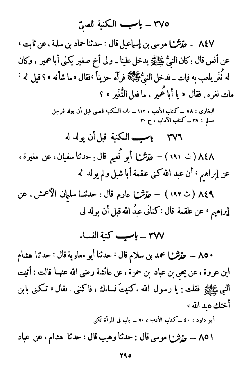 850 - حَدَّثَنَا مُحَمَّدُ بْنُ سَلَّامٍ قَالَ: حَدَّثَنَا أَبُو مُعَاوِيَةَ قَالَ: حَدَّثَنَا هِشَامُ بْنُ عُرْوَةَ، عَنْ يَحْيَى بْنِ عَبَّادِ بْنِ حَمْزَةَ، عَنْ عَائِشَةَ رَضِيَ اللَّهُ عَنْهَا قَالَتْ: أَتَيْتُ النَّبِيَّ صَلَّى اللهُ عَلَيْهِ وَسَلَّمَ فَقُلْتُ: يَا رَسُولَ اللَّهِ، كَنَّيْتَ نِسَاءَكَ، فَاكْنِنِي، فَقَالَ: «§تَكَنِّي بِابْنِ أُخْتِكِ عَبْدِ اللَّهِ» Kصحيح