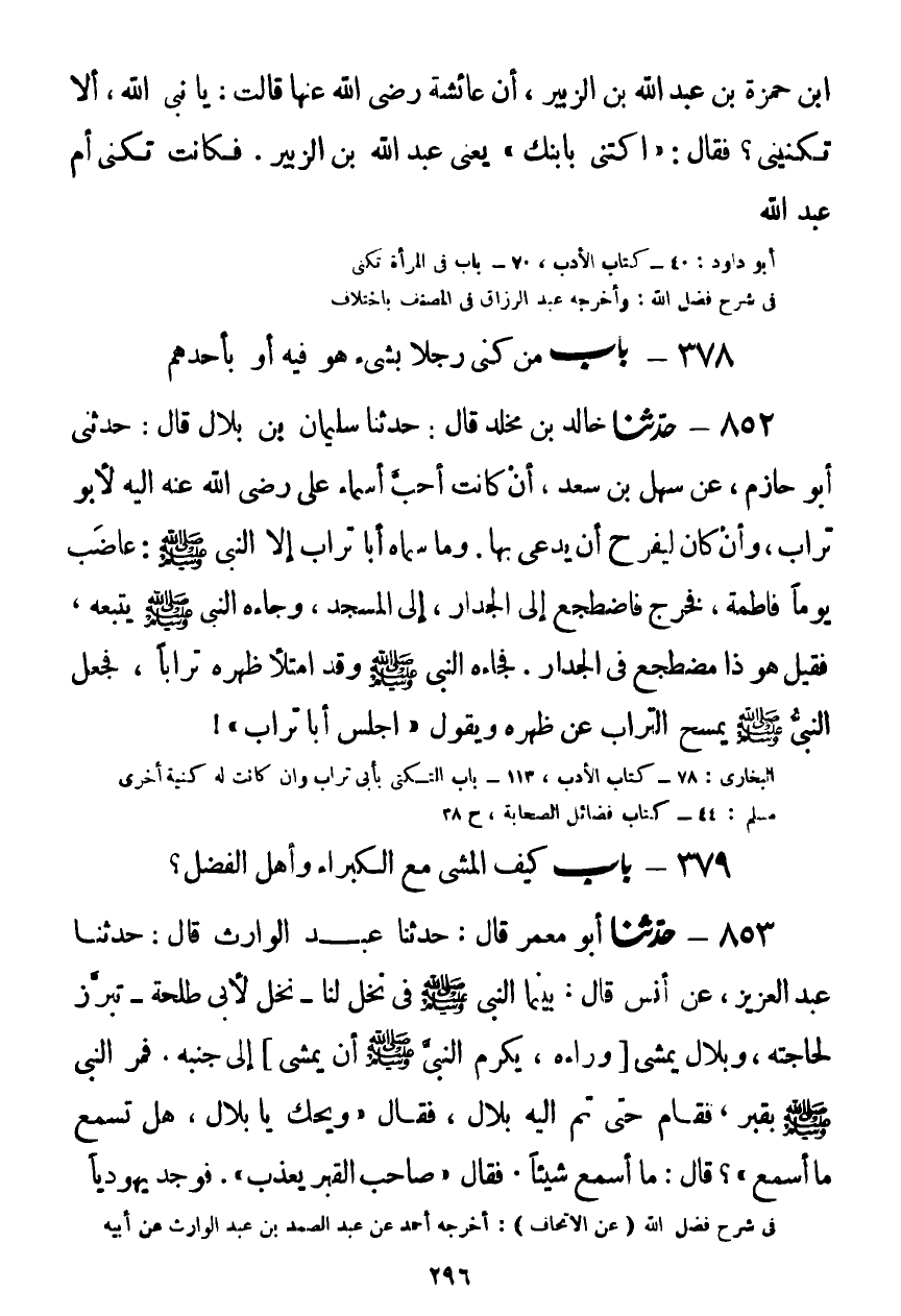 852 - حَدَّثَنَا خَالِدُ بْنُ مَخْلَدٍ قَالَ: حَدَّثَنَا سُلَيْمَانُ بْنُ بِلَالٍ قَالَ: حَدَّثَنِي أَبُو حَازِمٍ، عَنْ سَهْلِ بْنِ سَعْدٍ، إِنْ كَانَتْ أَحَبَّ أَسْمَاءِ عَلِيٍّ رَضِيَ اللَّهُ عَنْهُ إِلَيْهِ لَأَبُو تُرَابٍ، وَإِنْ كَانَ لَيَفْرَحُ أَنْ يُدْعَى بِهَا، وَمَا سَمَّاهُ أَبَا تُرَابٍ إِلَّا النَّبِيُّ صَلَّى اللهُ عَلَيْهِ وَسَلَّمَ، غَاضَبَ يَوْمًا فَاطِمَةَ، فَخَرَجَ فَاضْطَجَعَ إِلَى الْجِدَارِ إِلَى الْمَسْجِدِ، وَجَاءَهُ النَّبِيُّ صَلَّى اللهُ عَلَيْهِ وَسَلَّمَ يَتْبَعُهُ، فَقَالَ: هُوَ ذَا مُضْطَجِعٌ فِي الْجِدَارِ، فَجَاءَ النَّبِيَّ صَلَّى اللهُ عَلَيْهِ وَسَلَّمَ وَقَدِ امْتَلَأَ ظَهْرُهُ تُرَابًا، فَجَعَلَ النَّبِيُّ صَلَّى اللهُ عَلَيْهِ وَسَلَّمَ §يَمْسَحُ التُّرَابَ عَنْ ظَهْرِهِ وَيَقُولُ: «اجْلِسْ أَبَا تُرَابٍ» Kصحيح