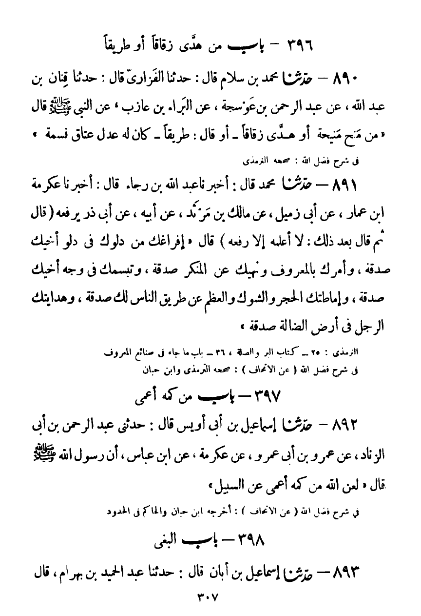 890 - حَدَّثَنَا مُحَمَّدُ بْنُ سَلَّامٍ قَالَ: حَدَّثَنَا الْفَزَارِيُّ قَالَ: حَدَّثَنَا قِنَانُ بْنُ عَبْدِ اللَّهِ، عَنْ عَبْدِ الرَّحْمَنِ بْنِ عَوْسَجَةَ، عَنِ الْبَرَاءِ بْنِ عَازِبٍ، عَنِ النَّبِيِّ صَلَّى اللهُ عَلَيْهِ وَسَلَّمَ قَالَ: " §مَنْ مَنَحَ مَنِيحَةً أَوْ هَدَّى زُقَاقًا - أَوْ قَالَ: طَرِيقًا - كَانَ لَهُ عَدْلُ عِتَاقِ نَسَمَةٍ "Kصحيح