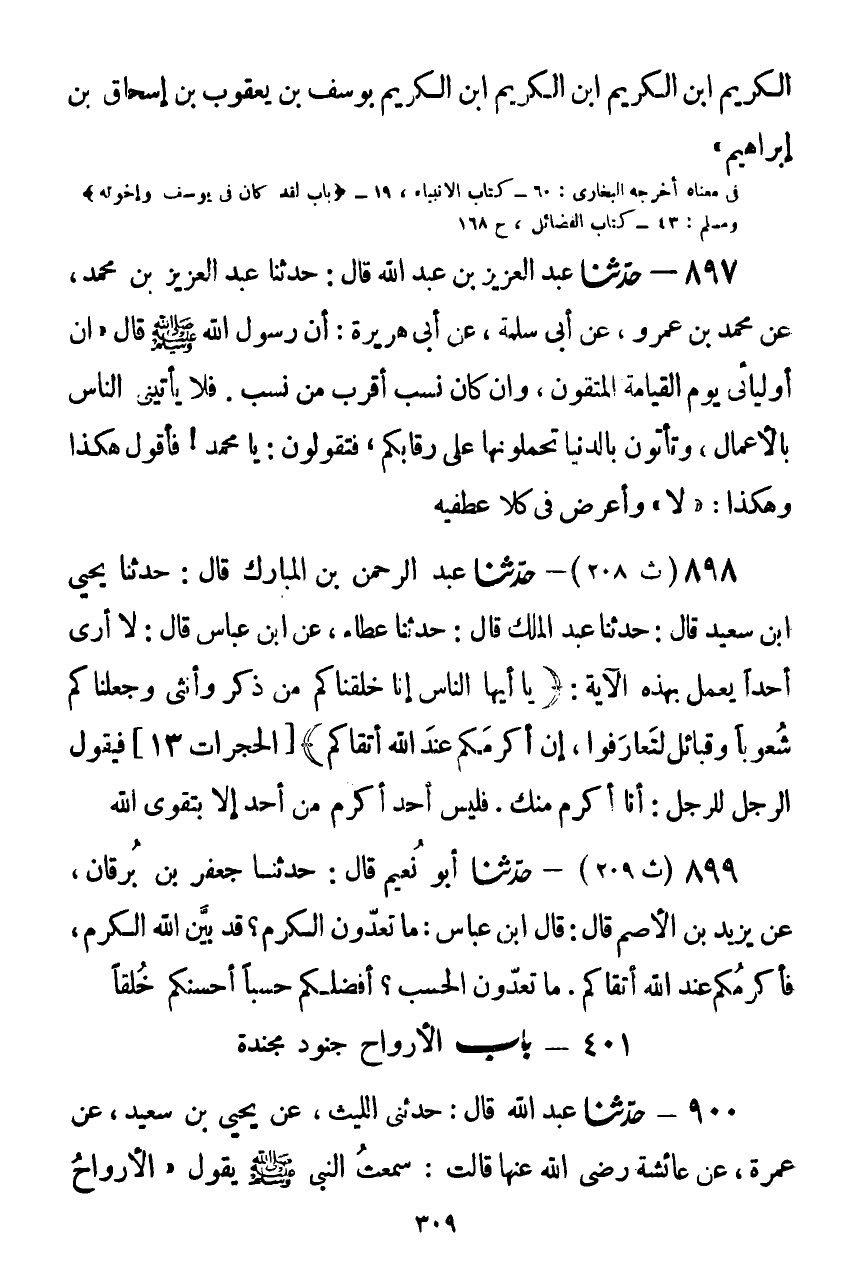 898 - حَدَّثَنَا عَبْدُ الرَّحْمَنِ بْنُ الْمُبَارَكِ قَالَ: حَدَّثَنَا يَحْيَى بْنُ سَعِيدٍ قَالَ: حَدَّثَنَا عَبْدُ الْمَلِكِ قَالَ: حَدَّثَنَا عَطَاءٌ، عَنِ ابْنِ عَبَّاسٍ قَالَ: لَا أَرَى أَحَدًا يَعْمَلُ بِهَذِهِ الْآيَةِ: {يَا أَيُّهَا النَّاسُ إِنَّا خَلَقْنَاكُمْ مِنْ ذَكَرٍ وَأُنْثَى} [الحجرات: 13] حَتَّى بَلَغَ: {إِنَّ أَكْرَمَكُمْ عِنْدَ اللَّهِ أَتْقَاكُمْ} [الحجرات: 13] ، فَيَقُولُ الرَّجُلُ لِلرَّجُلِ: أَنَا أَكْرَمُ مِنْكَ، §فَلَيْسَ أَحَدٌ أَكْرَمَ مِنْ أَحَدٍ إِلَّا بِتَقْوَى اللَّهِKصحيح
