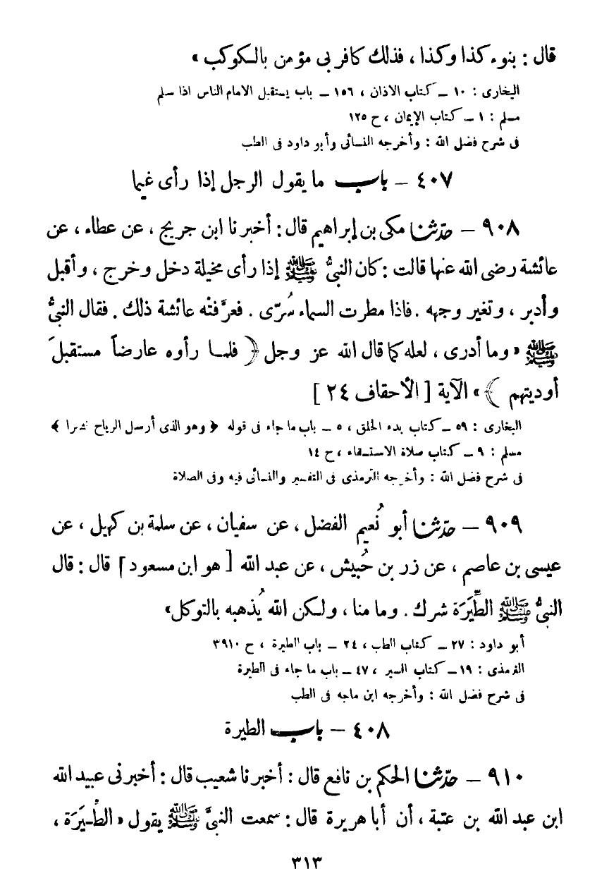 908 - حَدَّثَنَا مَكِّيُّ بْنُ إِبْرَاهِيمَ قَالَ: أَخْبَرَنَا ابْنُ جُرَيْجٍ، عَنْ عَطَاءٍ، عَنْ عَائِشَةَ رَضِيَ اللَّهُ عَنْهَا قَالَتْ: كَانَ النَّبِيُّ صَلَّى اللهُ عَلَيْهِ وَسَلَّمَ إِذَا رَأَى مَخِيلَةً دَخَلَ وَخَرَجَ، وَأَقْبَلَ وَأَدْبَرَ، وَتَغَيَّرَ وَجْهُهُ، فَإِذَا مَطَرَتِ السَّمَاءُ سُرِّيَ، فَعَرَّفَتْهُ عَائِشَةُ ذَلِكَ، فَقَالَ النَّبِيُّ صَلَّى اللهُ عَلَيْهِ وَسَلَّمَ: " وَمَا أَدْرِي لَعَلَّهُ كَمَا قَالَ اللَّهُ عَزَّ وَجَلَّ: {§فَلَمَّا رَأَوْهُ عَارِضًا مُسْتَقْبِلَ أَوْدِيَتِهِمْ} [الأحقاف: 24] "Kصحيح