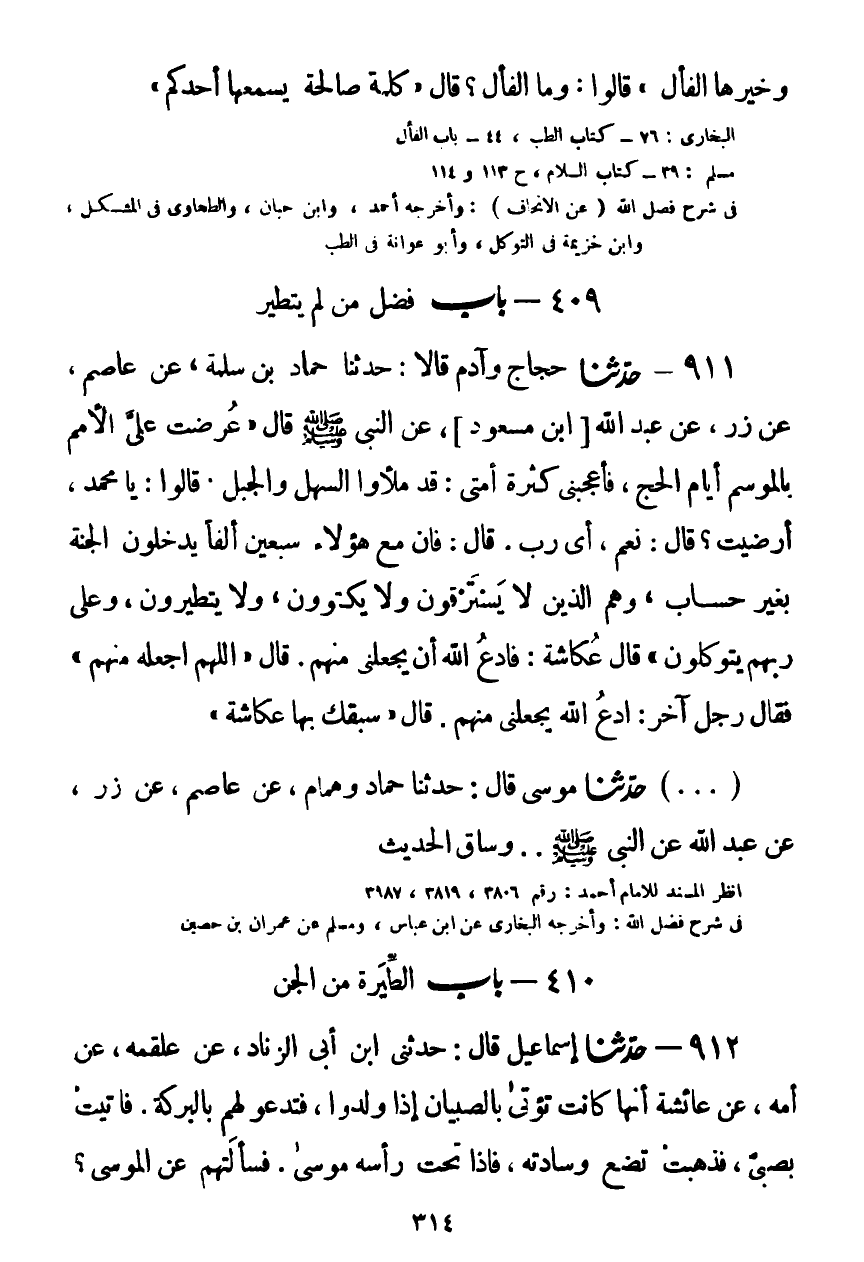 911 - حَدَّثَنَا حَجَّاجٌ، وَآدَمُ، قَالَا: حَدَّثَنَا حَمَّادُ بْنُ سَلَمَةَ، عَنْ عَاصِمٍ، عَنْ زِرٍّ، عَنْ عَبْدِ اللَّهِ بْنِ مَسْعُودٍ، عَنِ النَّبِيِّ صَلَّى اللهُ عَلَيْهِ وَسَلَّمَ قَالَ: " §عُرِضَتْ عَلَيَّ الْأُمَمُ بِالْمَوْسِمِ أَيَّامَ الْحَجِّ، فَأَعْجَبَنِي كَثْرَةُ أُمَّتِي، قَدْ مَلَأُوا السَّهْلَ وَالْجَبَلَ، قَالُوا: يَا مُحَمَّدُ، أَرَضِيتَ؟ قَالَ: نَعَمْ، أَيْ رَبِّ، قَالَ: فَإِنَّ مَعَ هَؤُلَاءِ سَبْعِينَ أَلْفًا يَدْخُلُونَ الْجَنَّةَ بِغَيْرِ حِسَابٍ، وَهُمُ الَّذِينَ لَا يَسْتَرْقُونَ وَلَا يَكْتَوُونَ، وَلَا يَتَطَيَّرُونَ، وَعَلَى رَبِّهِمْ يَتَوَكَّلُونَ "، قَالَ عُكَّاشَةُ: فَادْعُ اللَّهَ أَنْ يَجْعَلَنِي مِنْهُمْ، قَالَ: «اللَّهُمَّ اجْعَلْهُ مِنْهُمْ» ، فَقَالَ رَجُلٌ آخَرُ: ادْعُ اللَّهَ يَجْعَلَنِي مِنْهُمْ، قَالَ: «سَبَقَكَ بِهَا عُكَّاشَةُ»