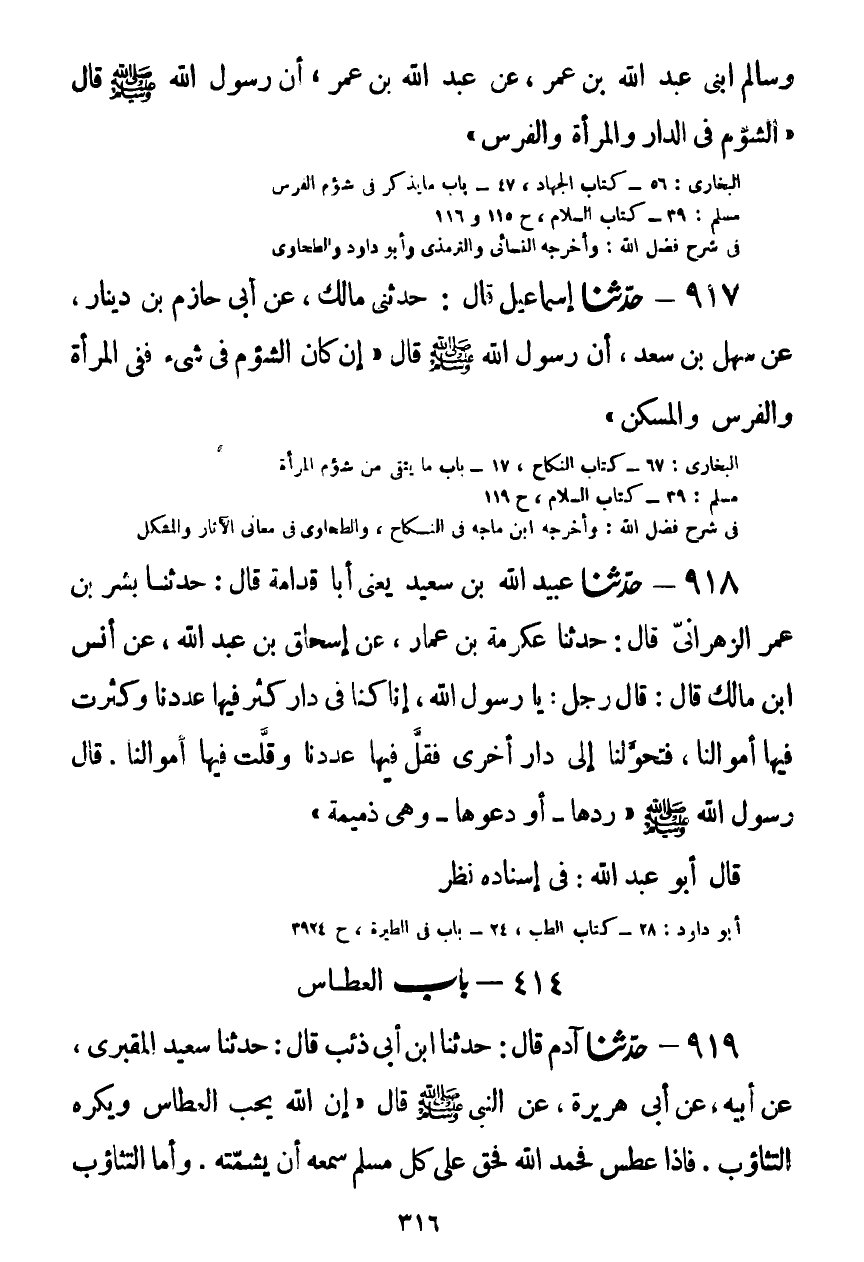 917 - حَدَّثَنَا إِسْمَاعِيلُ قَالَ: حَدَّثَنِي مَالِكٌ، عَنْ أَبِي حَازِمِ بْنِ دِينَارٍ، عَنْ سَهْلِ بْنِ سَعْدٍ، أَنَّ رَسُولَ اللَّهِ صَلَّى اللهُ عَلَيْهِ وَسَلَّمَ قَالَ: «§إِنْ كَانَ الشُّؤْمُ فِي شَيْءٍ، فَفِي الْمَرْأَةِ، وَالْفَرَسِ، وَالْمَسْكَنِ» Kصحيح
